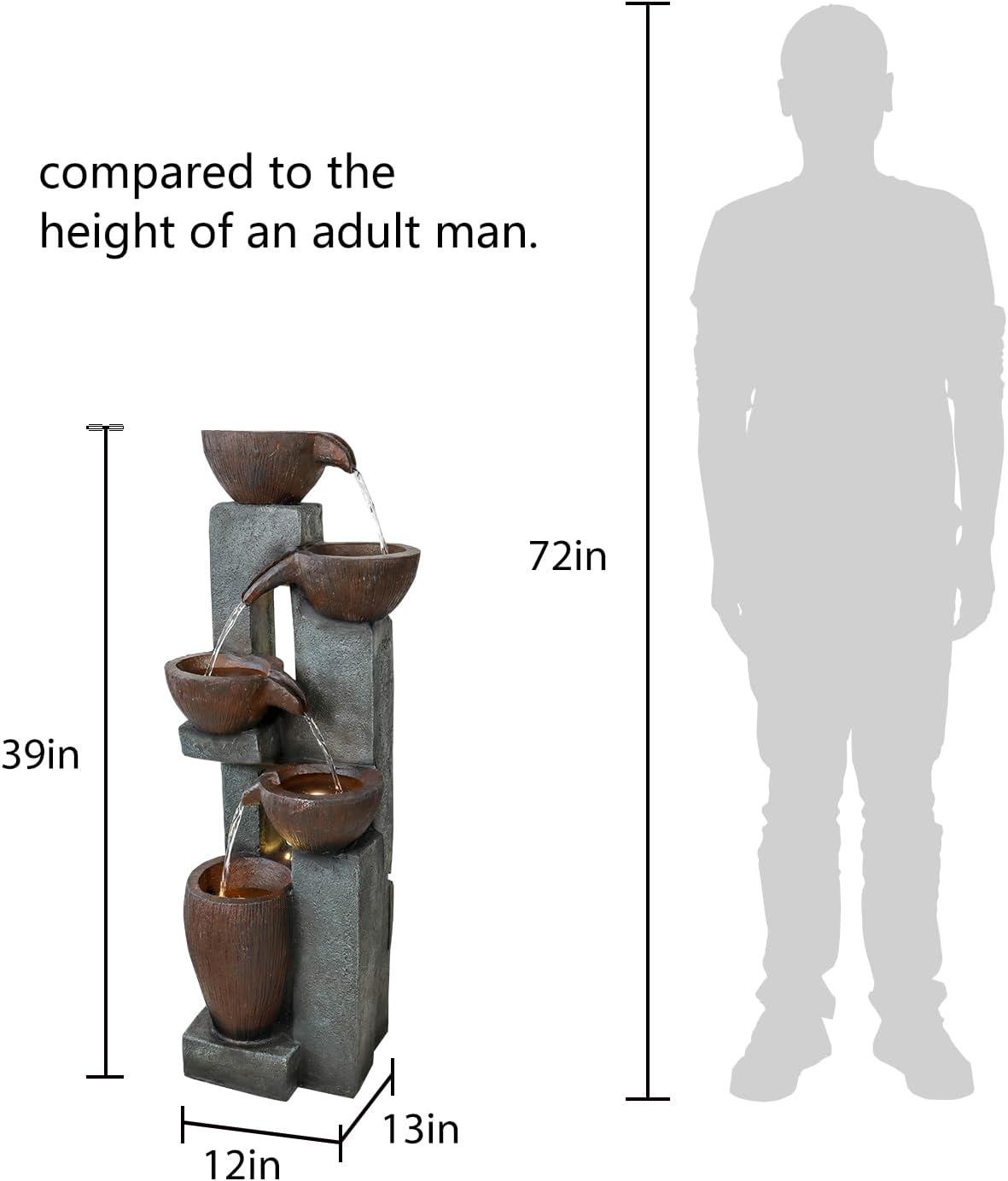 Naturefalls 39” H Modern Outdoor Fountain - 5 Crocks Outdoor Garden Fountains with Contemporary Design&LED Light for Garden, Patio, Deck, Porch, Backyard and Home Art Decor