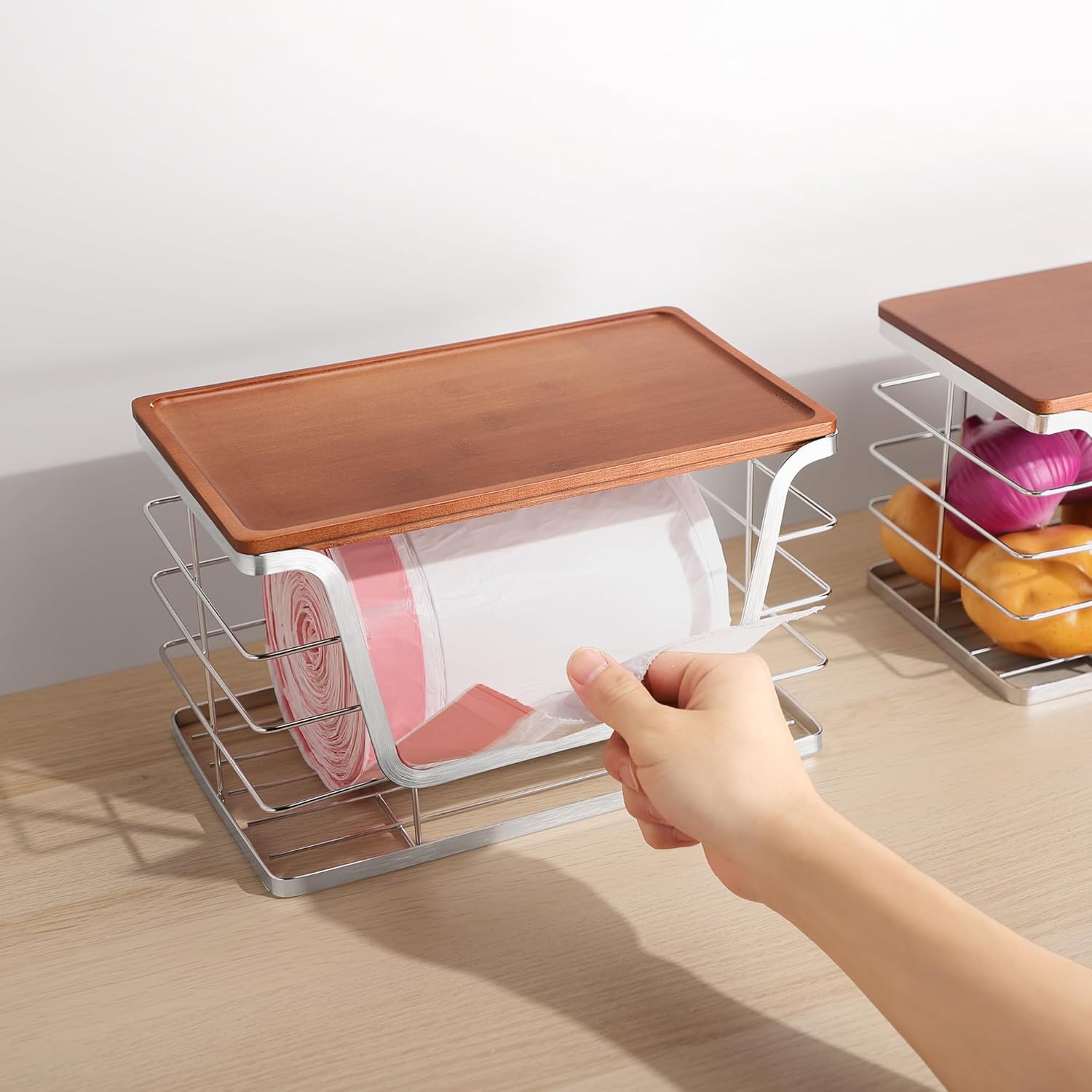 • Stackable Design: The trash bag holder can be stacked vertically to save space to the maximum extent, and the stackable bamboo top can be used to place other items such as bread and snacks. The storage box can be widely used in food storage rooms, under the kitchen sink, or laundry room storage
