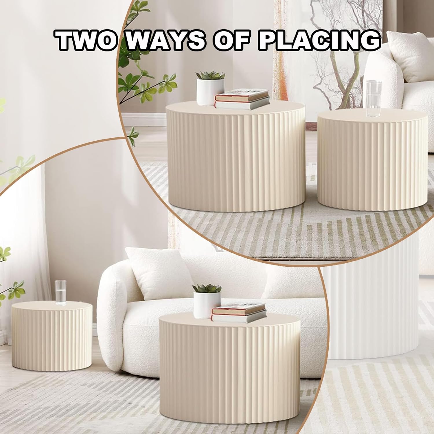 Round Nesting Coffee Table Set of 2, Modern Coffee and End Table Set Small Circle Wooden Drum Side Table Accent End Tables for Living Room Office, No Assembly,Cream Small