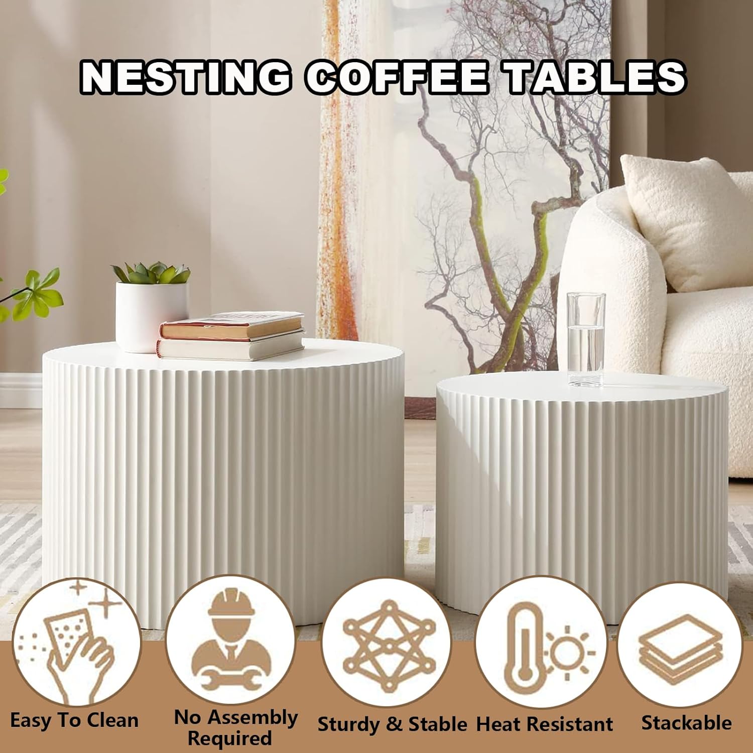 Round Nesting Coffee Table Set of 2, Modern Coffee and End Table Set Small Circle Wooden Drum Side Table Accent End Tables for Living Room Office, No Assembly,Cream Large