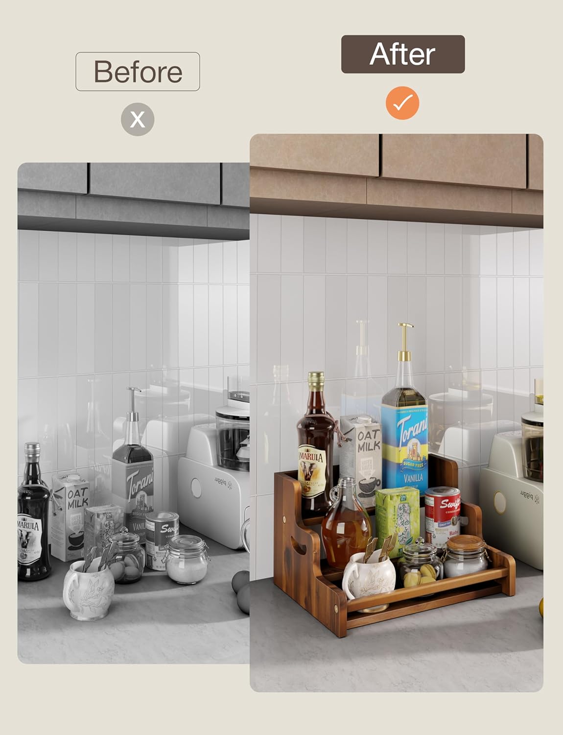 • Durable Acacia Wood Construction: Crafted from thick, natural acacia wood, this liquor bottle display shelf is designed for daily use. The waterproof finish and smooth surface make it easy to maintain, ideal for showcasing wine, whiskey, or syrups as a coffee syrup rack or countertop wine rack