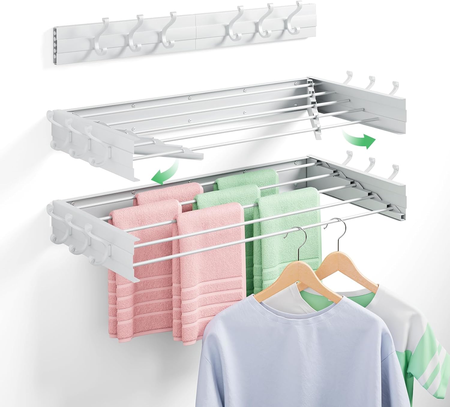 • 【Multiple Hanging Methods】Our added 6 hooks on the side of the wall mount drying rack, which has the advantage of providing extra hanging space, and the hooks can also hang anything when in folded state, which makes this drying rack wall mounted a good choice for limited space.