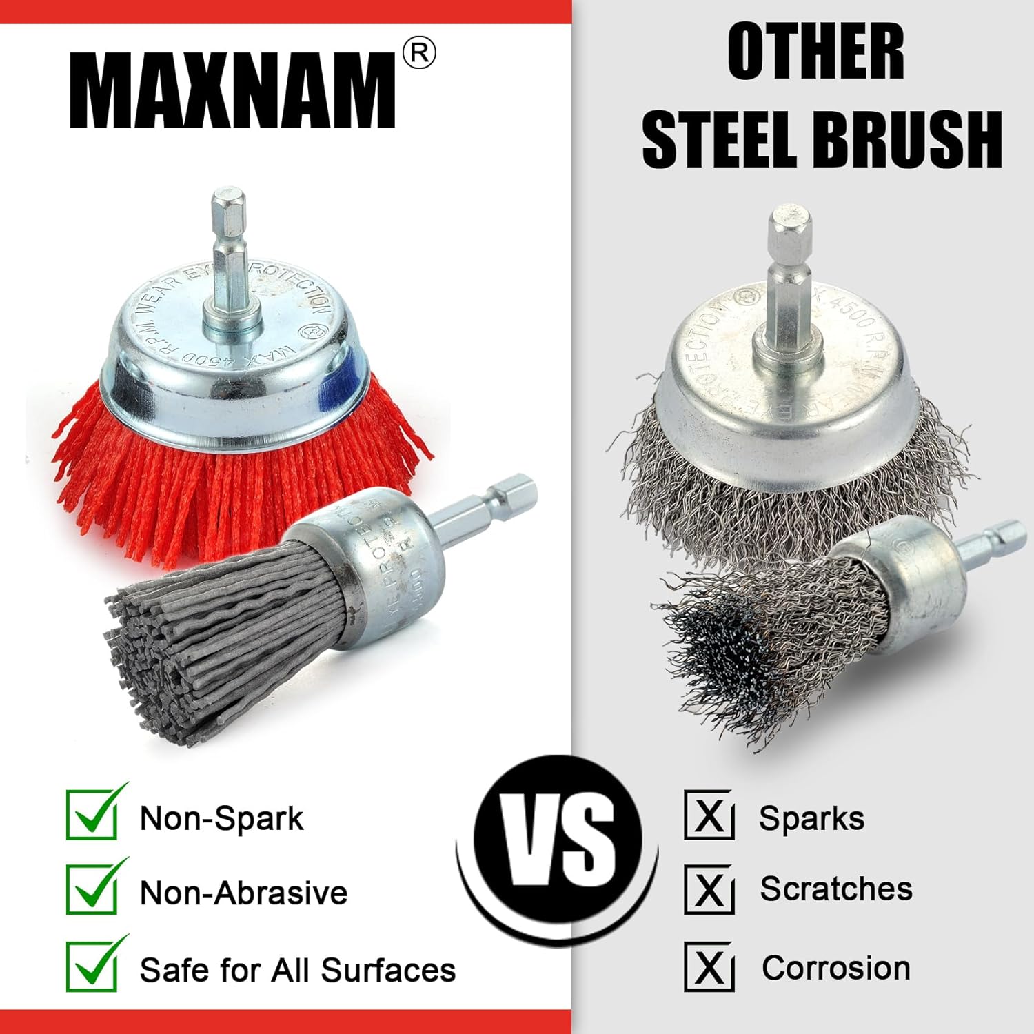 • Safe & Non-Damaging: Nylon bristles won’t spark, rustproof nylon bristles prevent skin punctures and surface scratches—perfect for rust removal, paint stripping, and surface prep