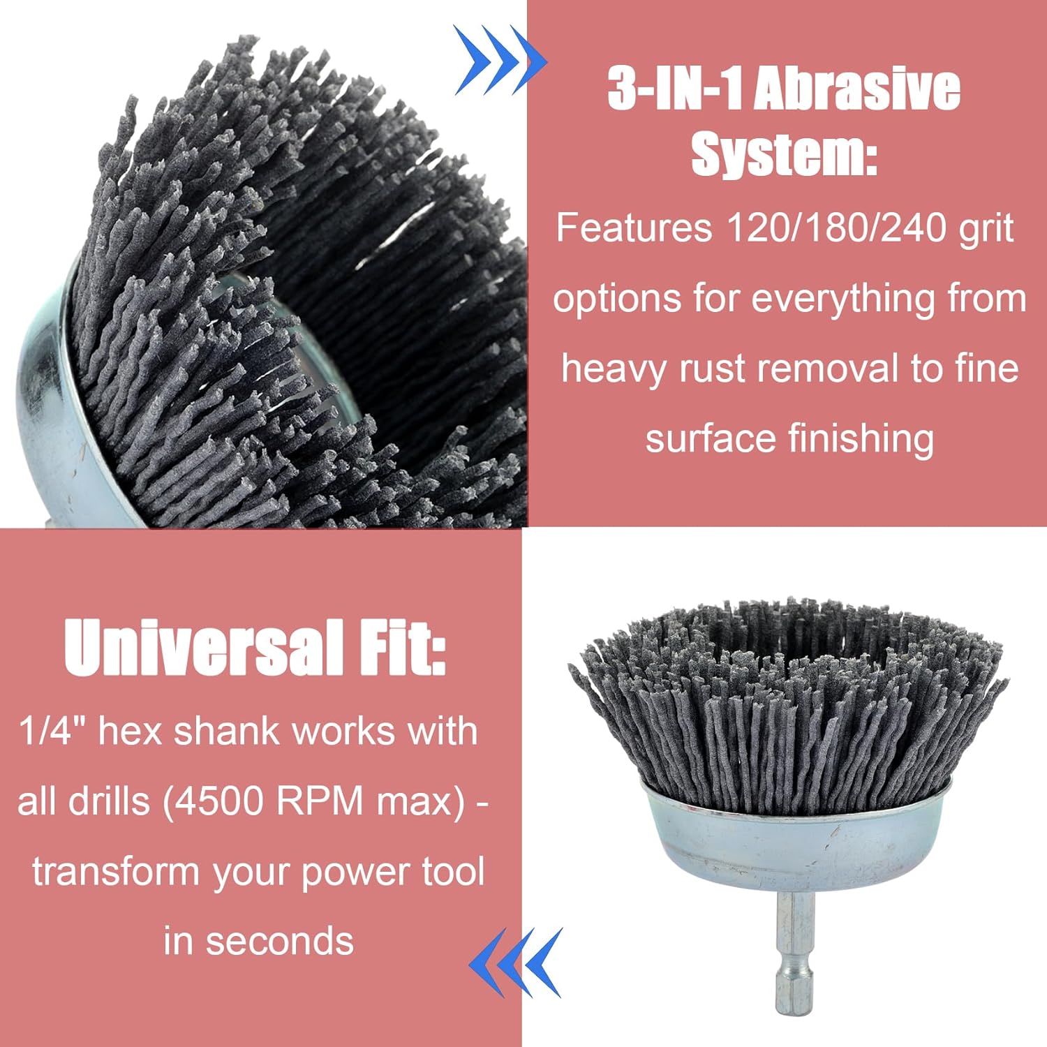 • Durable & Drill-Ready Design: Featuring 1/4” hex shank compatibility with most drills, these brushes withstand up to 4500 RPM. Self-renewing nylon filaments ensure sustained performance for grinding, scrubbing, or deburring