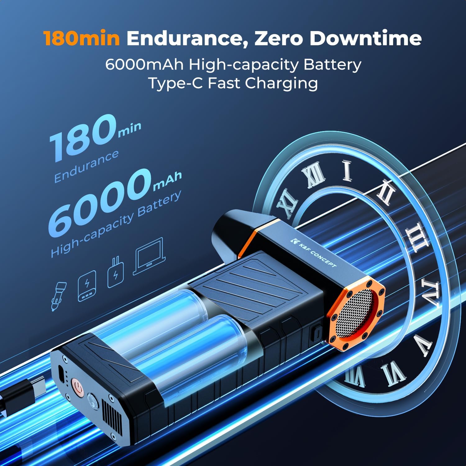 • 6000maAh POWERFUL & RECHARGEABLE - 3x Battery Capacity❗(vs. standard 2000mAh) delivers 180-minute runtime, with intelligent thermal protection: High-Speed Mode auto-shutoff activates after 10 minutes of continuous use to prevent motor overheating.