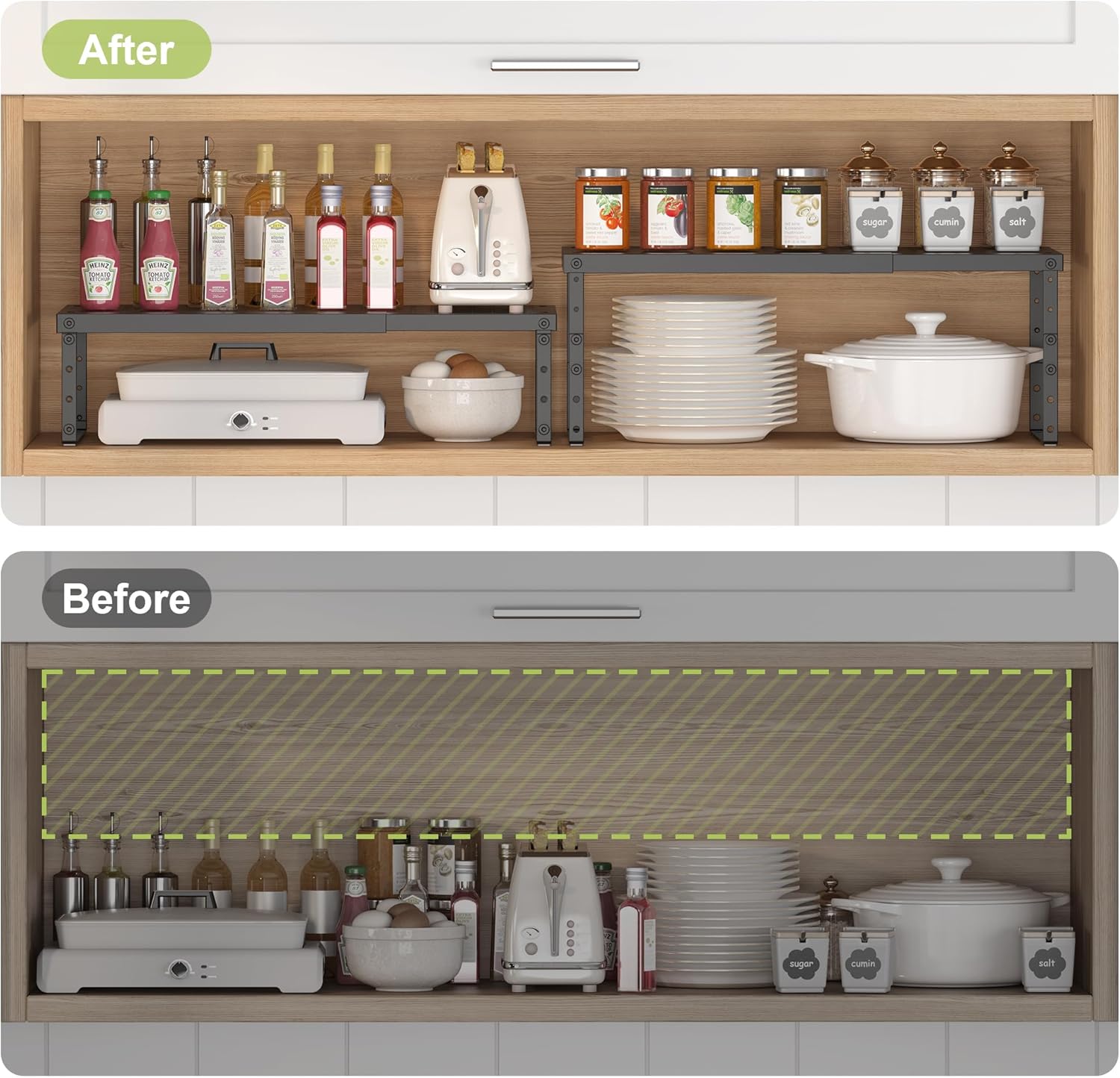 • 【Expandable Shelf Organizer】The length of cabinet shelf riser could be expandable from 14 to 22.4 inch to your desire, offers plenty of space for your kitchen essentials. This stackable pantry shelf rack can easily fit into a variety of different sizes of space. Extend sorage rack shelf to make full use of your space.