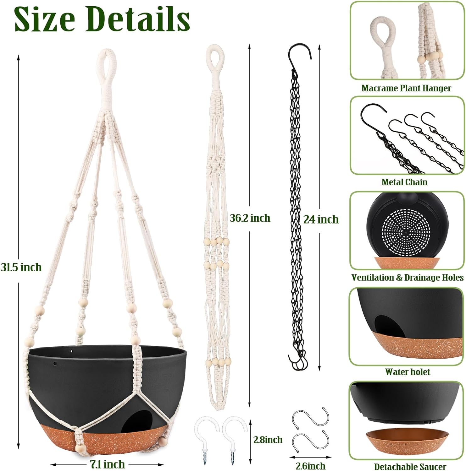 • 【Two Types of Plant Hangers】Our indoor plant hanging pots come with both metal hooks and cotton rope hangers, offering versatile solutions for different environments. The metal hooks are designed for outdoor use, built to withstand wind, rain, and sun exposure, ensuring long-lasting durability in harsh weather. The bohemian-style cotton rope hangers add a touch of elegance to indoor spaces, creating a cozy and stylish atmosphere for your plants.