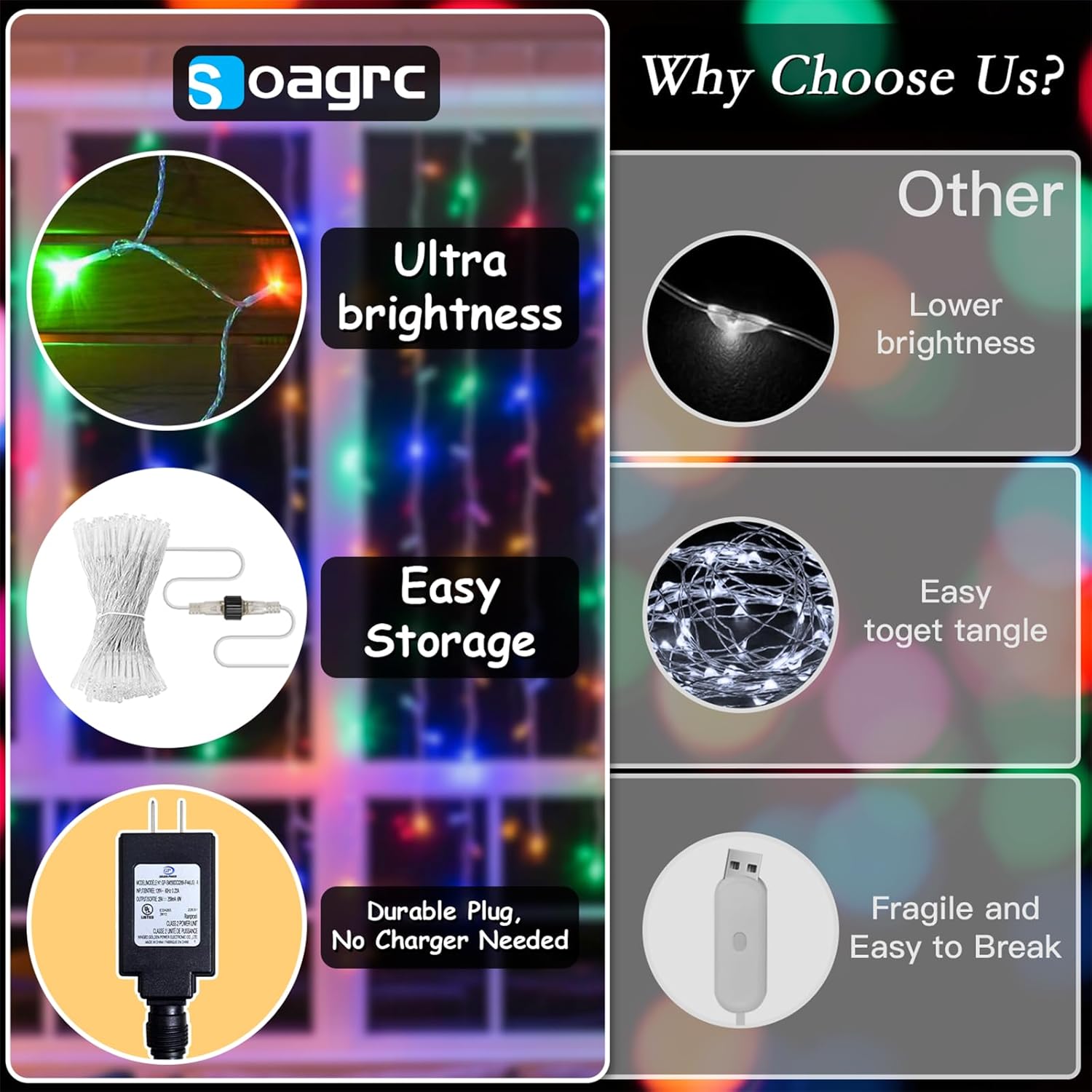 • Upgraded Durability for Everyday Use - Soagrc curtain string lights are crafted with enhanced copper wire and high-quality LEDs to ensure stronger durability. Tangle free and stable, they’re ideal for everyday use from dressing up your bedroom wall to adding a soft glow behind your reading nook or vanity mirror