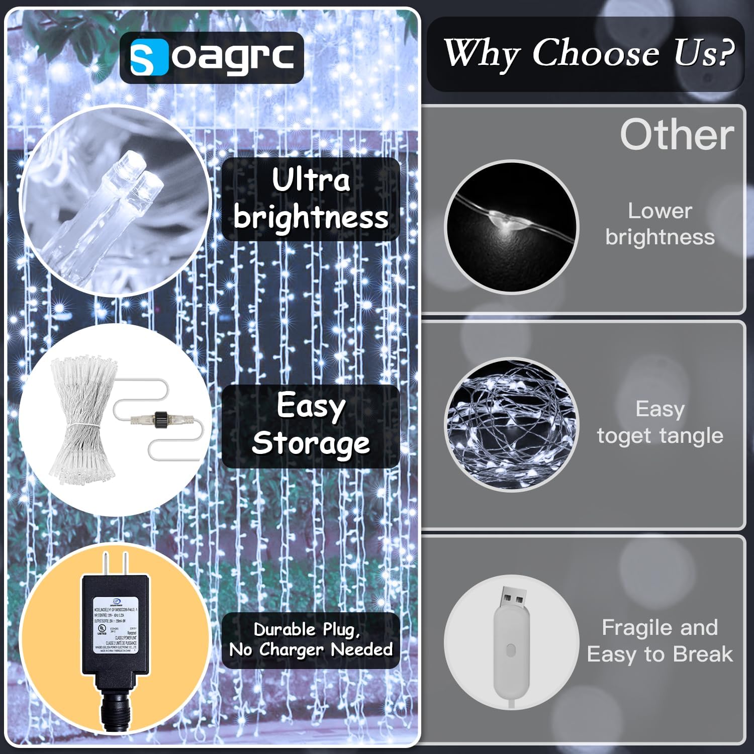 • Upgraded Durability for Everyday Use - Soagrc curtain string lights are crafted with enhanced copper wire and high-quality LEDs to ensure stronger durability. Tangle free and stable, they’re ideal for everyday use from dressing up your bedroom wall to adding a soft glow behind your reading nook or vanity mirror