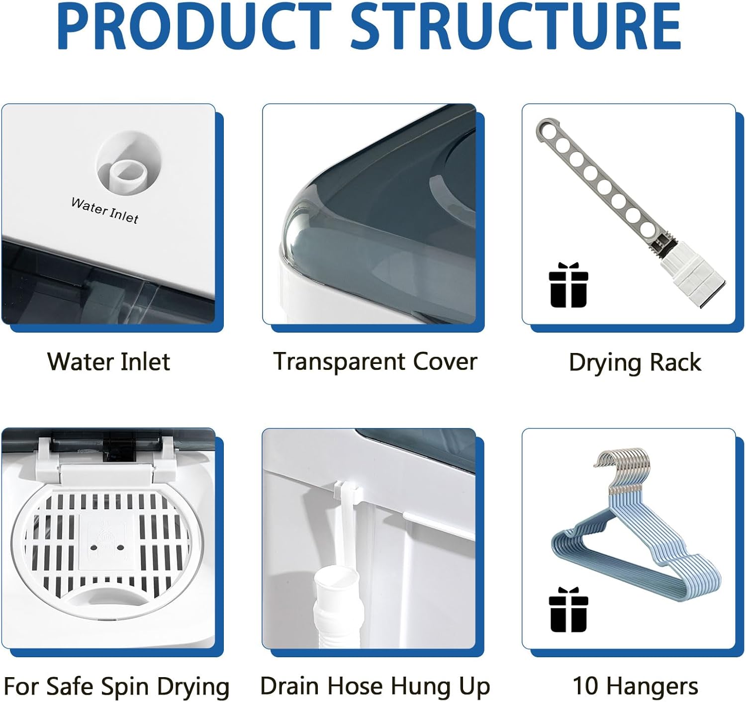 • 🌀【Dual-Tub Portable Washer】 This efficient washing machine features a dual-tub design, combining a 13 lbs washing tub and a 9 lbs spin dryer in one compact unit. Perfect for small apartments, dorms, or RVs, it handles light to medium laundry loads with ease.