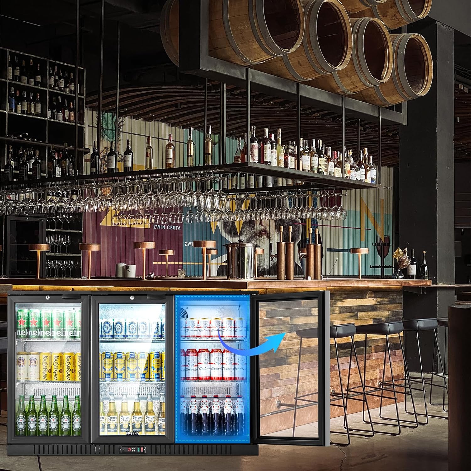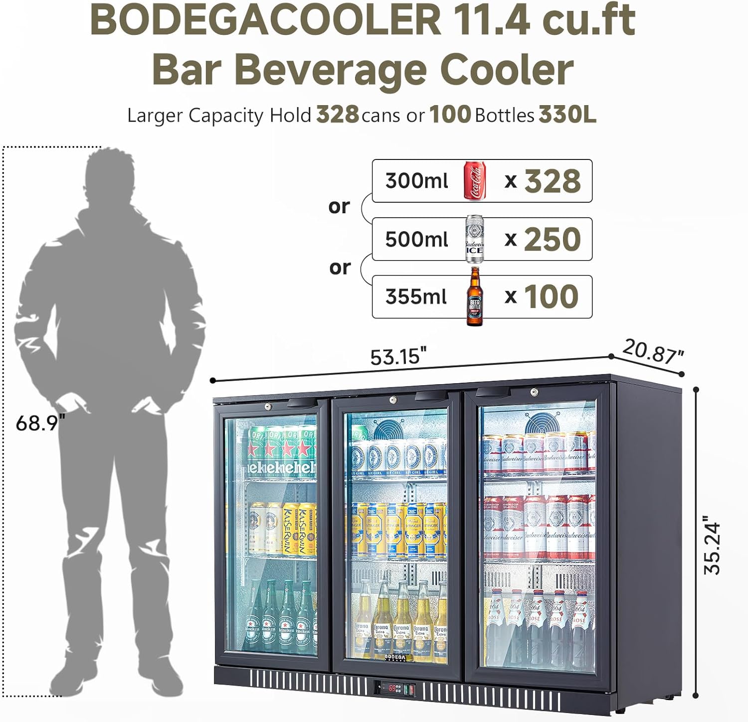 BODEGACOOLER Back Bar Cooler With 3 Glass Doors,11.4 Cu.Ft Commercial Back Bar Fridge with LED Lighting,Counter Height Bar Outdoor Beverage Cooler for Beer,Soda Drinks,Wine