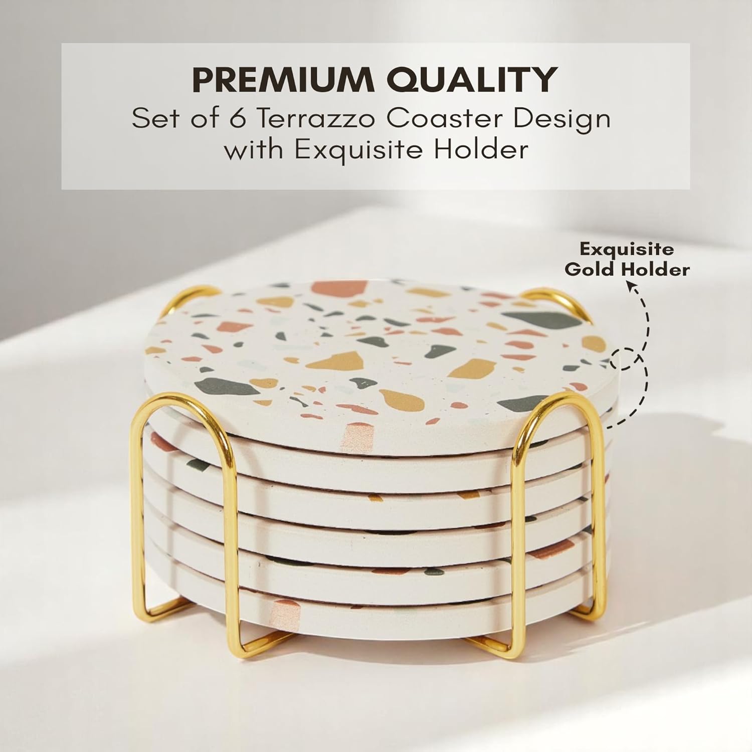 Terrazzo Drink Absorbent Coasters with Holder Set of 6, Ceramic Coaster for Drinks, Coffee Table Decor, Water Absorbing Stone Coaster for Drinks (Sunset)