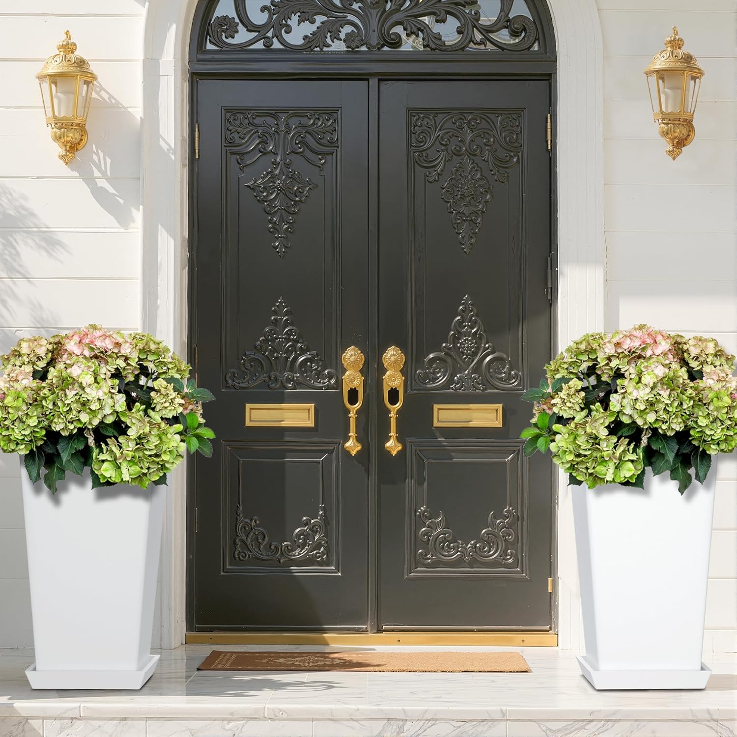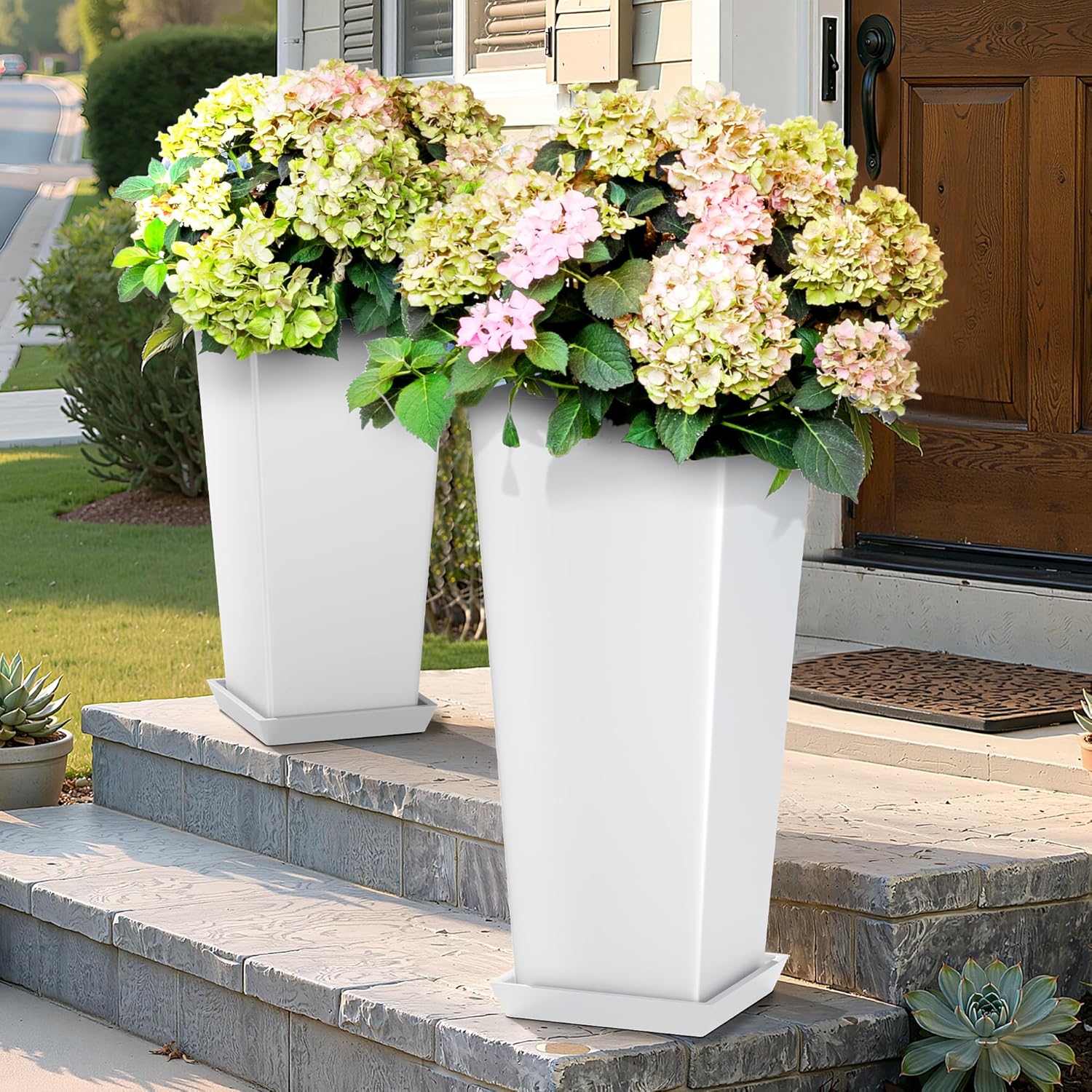 FENCY Set of 2 Tall Planters for Outdoor Plants, 24 Inch Large Tapered Pots with Drainage Trays, Weather-Resistant Plastic Plant Containers for Patio, Porch, Garden, Front Door Decor,White