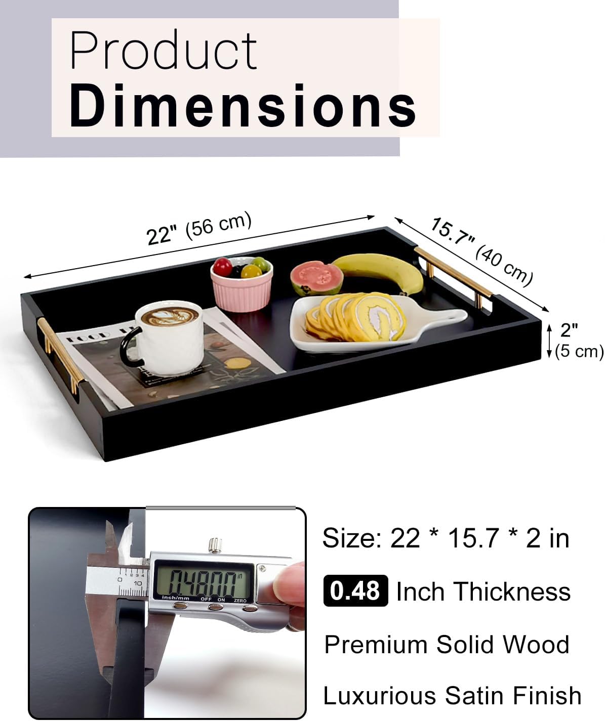 22 Inch Rectangle Black Ottoman Tray with Gold Metal Handles, Extra Large Wooden Serving Tray for Living Room, Coffee Table, Kitchen & Hosting