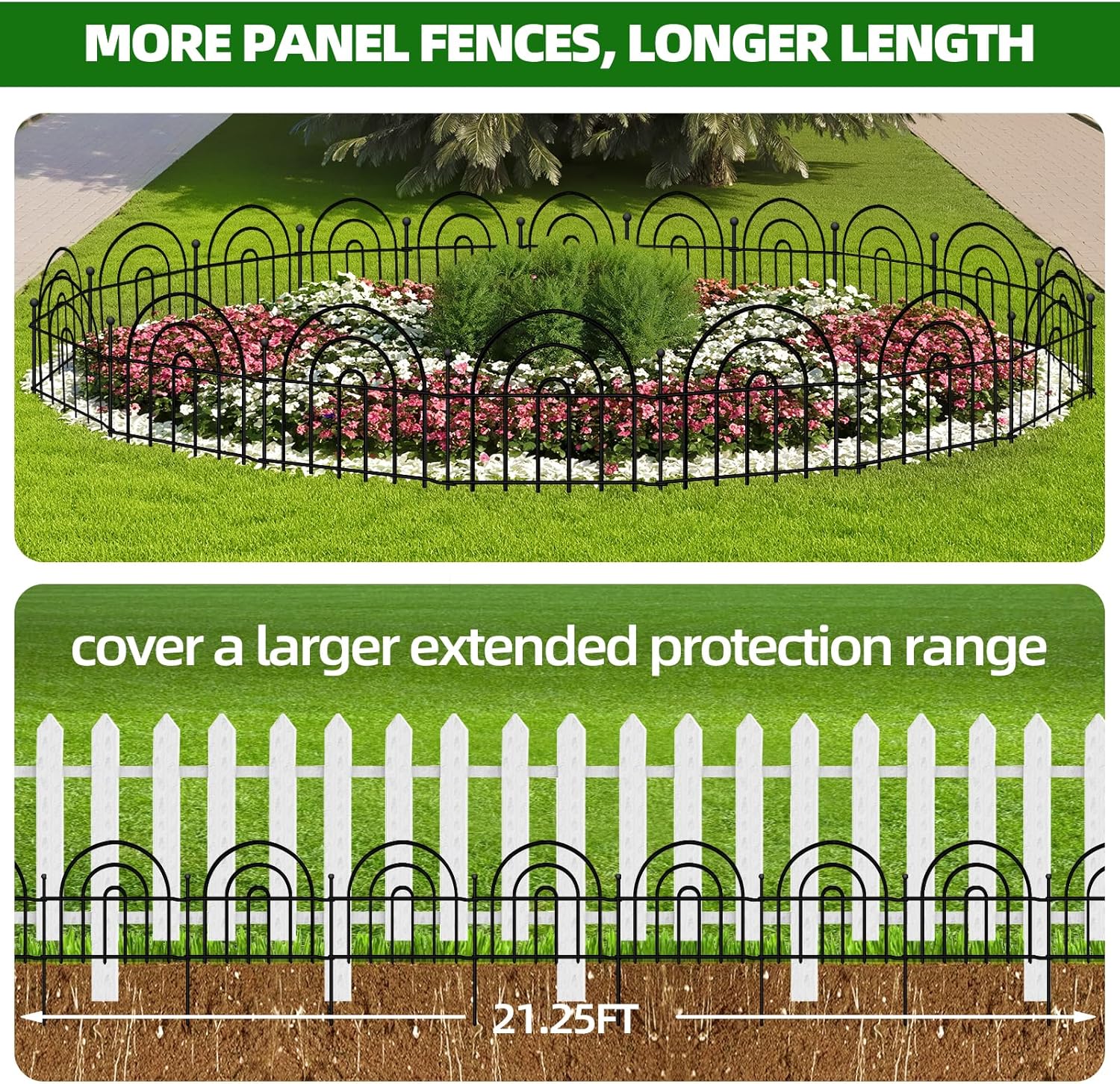 • Longer Size: Each piece of the garden fence barrier is 17" long and 13" high. The entire length of the 15 panels fence set is 21.25 feet long! Under same quantity, longer garden can be connected to make a larger fence, can be extended to different shapes according to your special uses. They can be arranged in one straight line, a curved shape, 'L', 'O' or zigzag shape, fence panels can be adjusted to uneven terrain