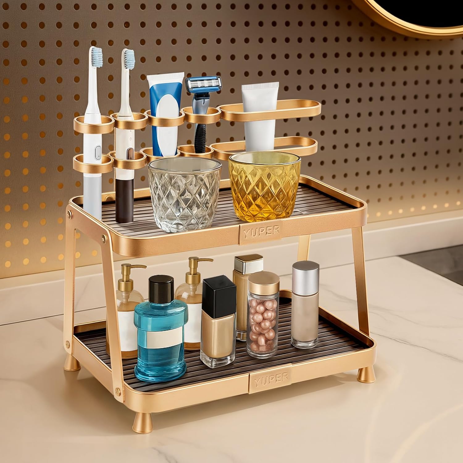 YUPER Bathroom Counter Organizer, 2-Tier Bathroom Organizer Countertop with Toothbrush Holder, Makeup Storage Shelf Vanity Tray Perfume Organizer, Bedroom Kicthen Counter Storage Sink Shelf Gold