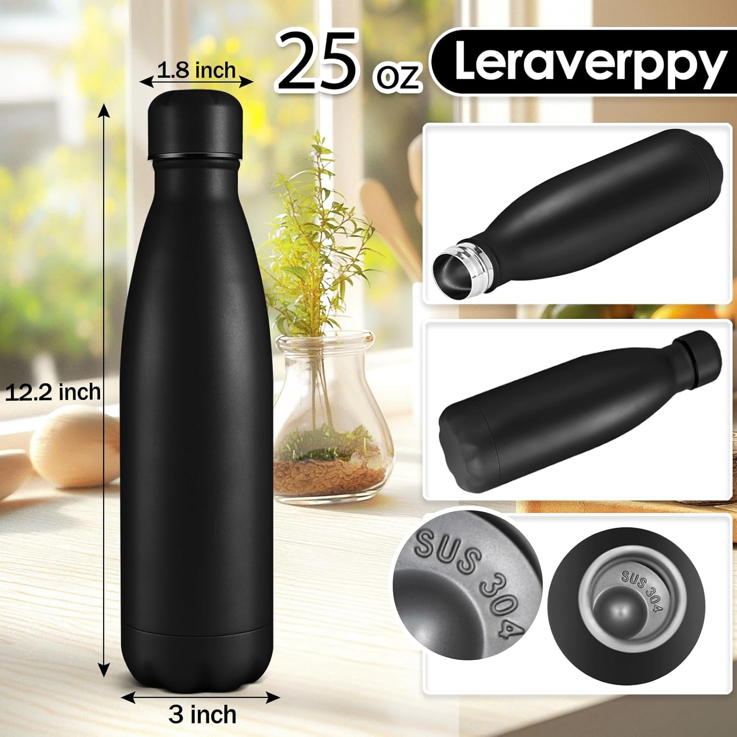 25oz Cola-Bottle Shaped Stainless Steel Leak-proof Water Bottle,Double Wall Vacuum Insulated Metal,Travel Mug For Sports Indoors & Outdoors,BPA-Free School Kids Flasks,Black(4 Pack)