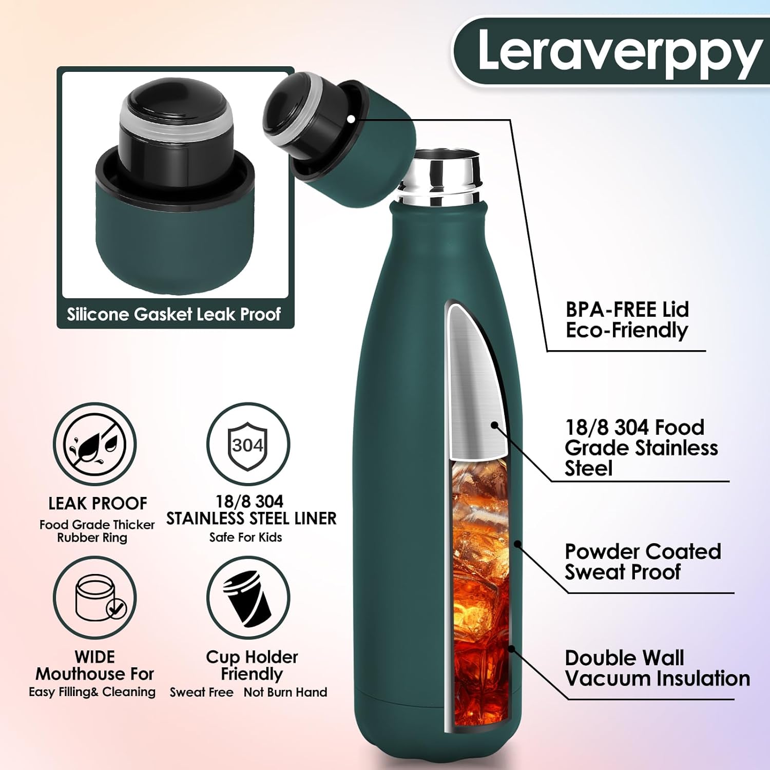 • 《Food-Grade 18/8 Stainless Steel Liner》Our water bottle is made of 18/8 food-grade known as 304 stainless steel.BPA Free,Non-toxic,No metallic taste,safe and healthy for all your water needs.Moms can trust our 304 stainless steel water bottles — designed to keep your little one’s drinks safe and healthy.Drink in the joy of every drop in your healthy life.