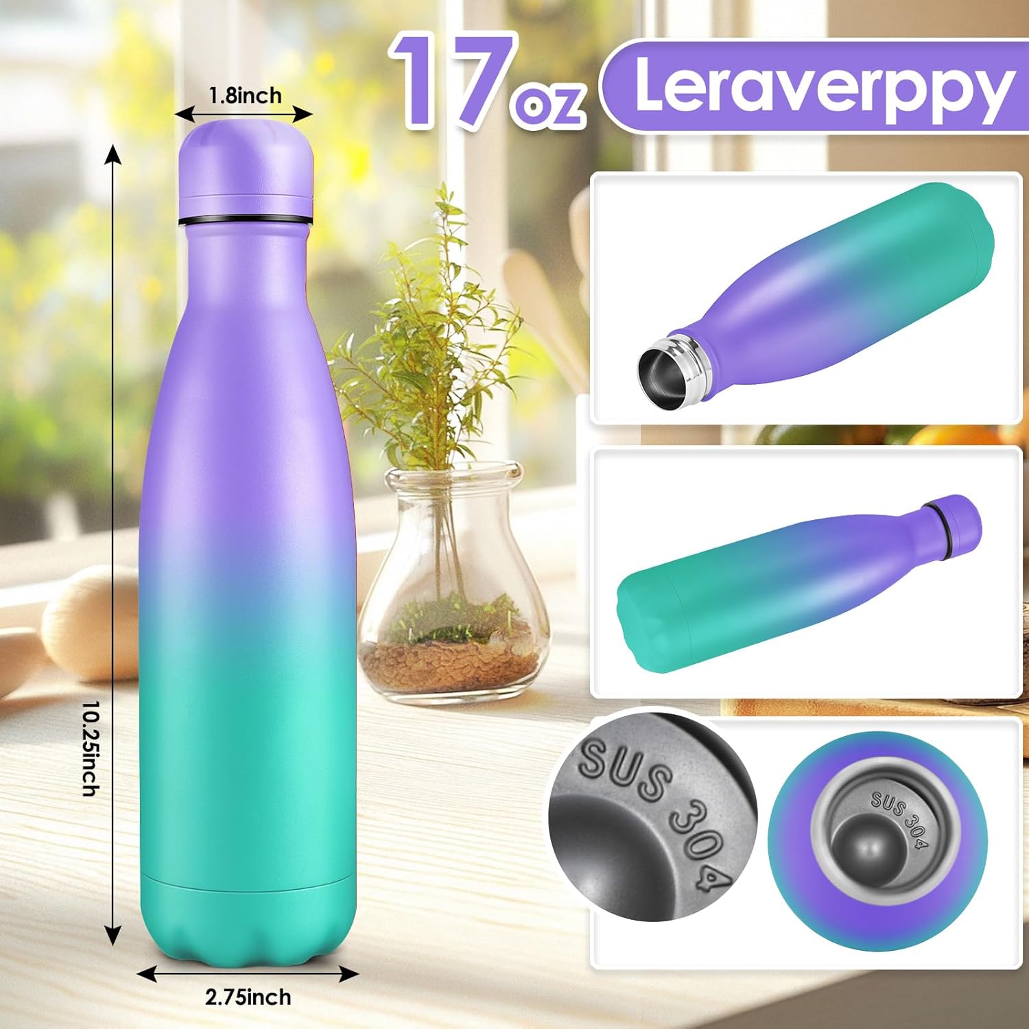 17oz Cola-Bottle Shaped Stainless Steel Leak-proof Water Bottle,Double Wall Vacuum Insulated Metal,Travel Mug For Sports Indoors & Outdoors,BPA-Free Kids Flasks,Purple Green(8Pack)