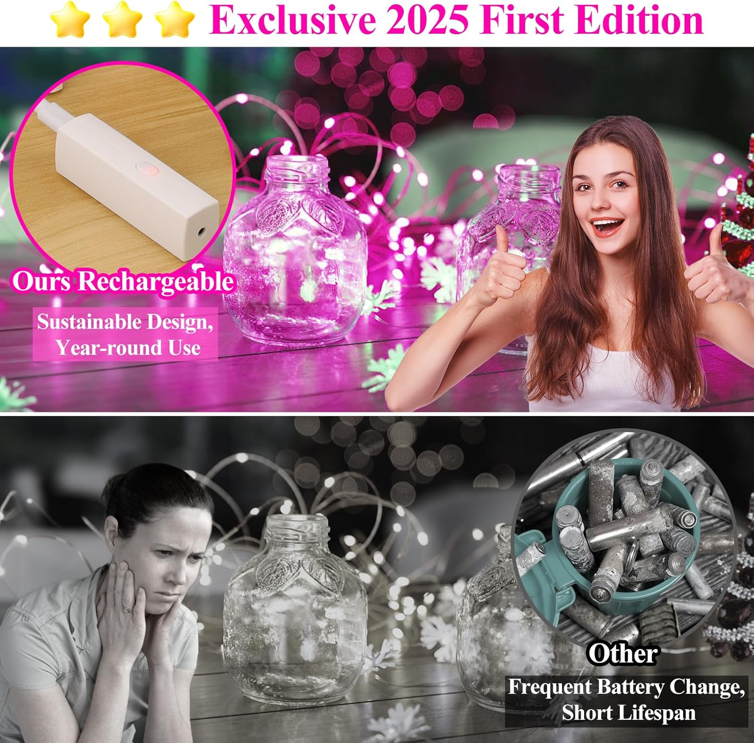 • 2025 Specially Developed Battery Operated String Lights: Say goodbye to disposable batteries and embrace sustainability! Our rechargeable Type-C power bank (cable included) powers the twinkle lights for 30+ hours of cordless glow. When it’s time to recharge, simply detach the compact, lipstick-sized power bank—no need to move the entire string lights. Designed with an innovative, patented structure, this power bank offers a smarter, greener way to shine