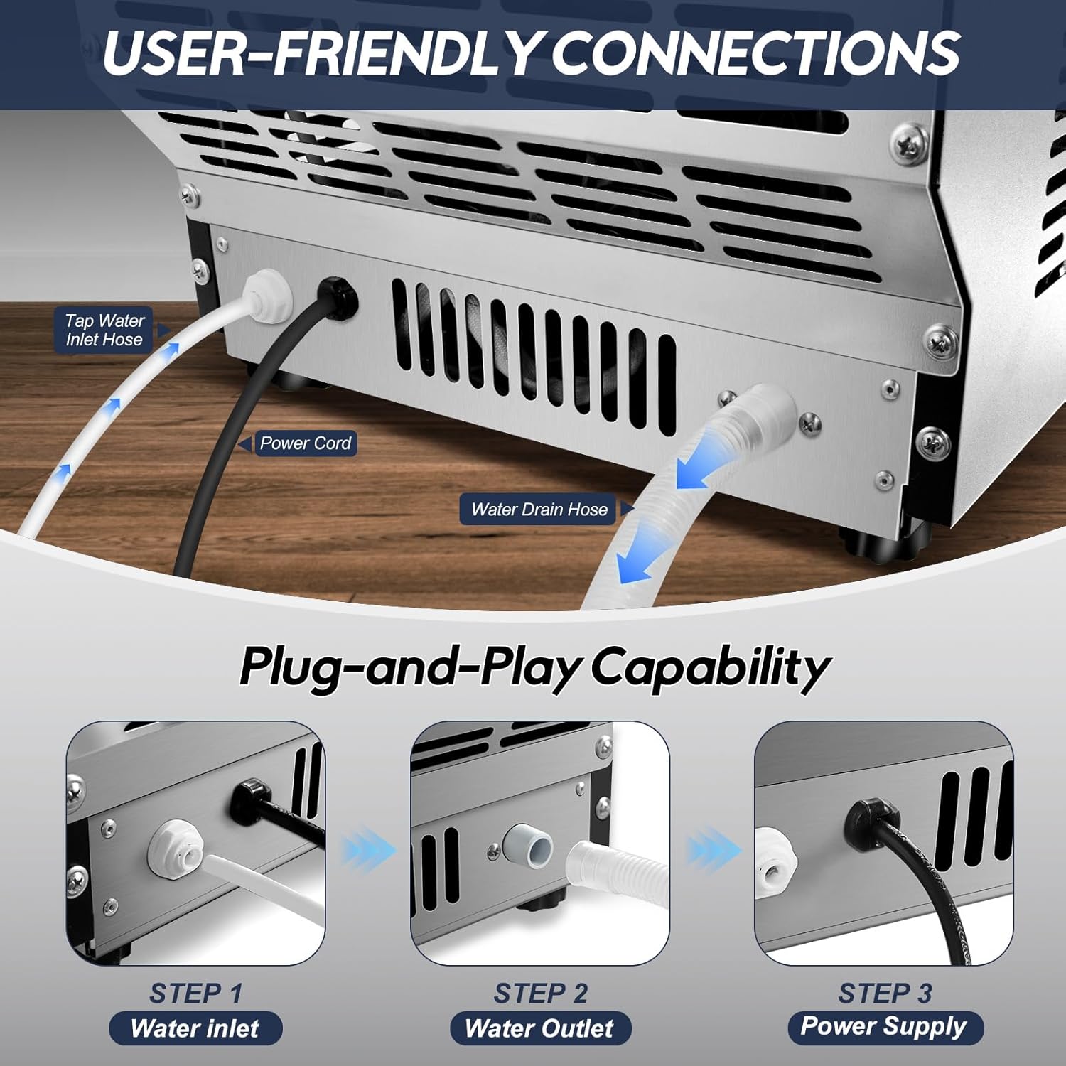 • Easy Installation & Operation - This ice maker comes with all necessary accessories, including a water inlet hose, drain hose, quick connector, and ice shovel. Simply connect the hoses, and the machine will automatically fill and drain, starting the ice-making cycle with ease.