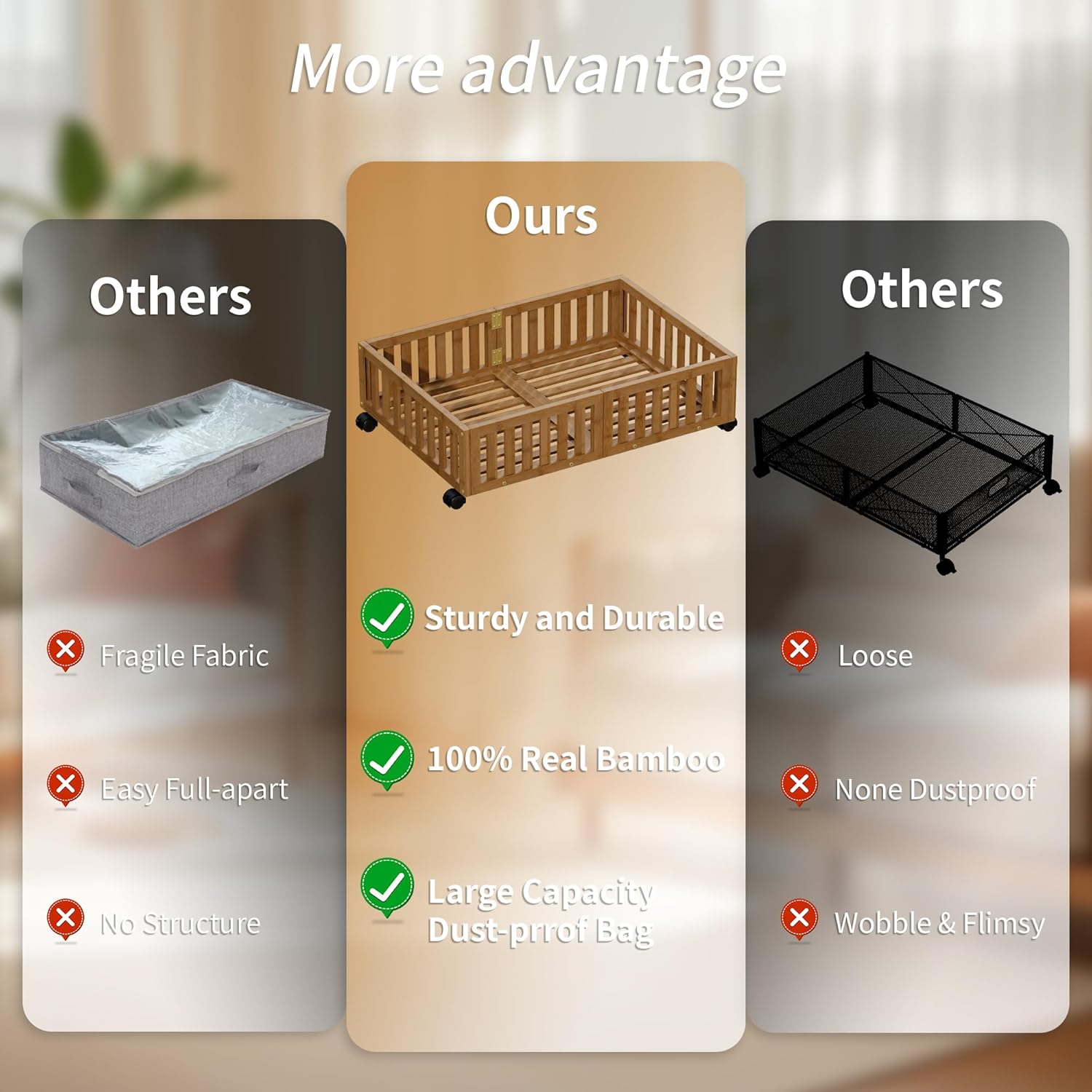 • Ventilated Design: The slatted bamboo design promotes air circulation, preventing musty odors and keeping your stored items fresh. A smart choice for under the bed storage with wheels to maintain item quality.