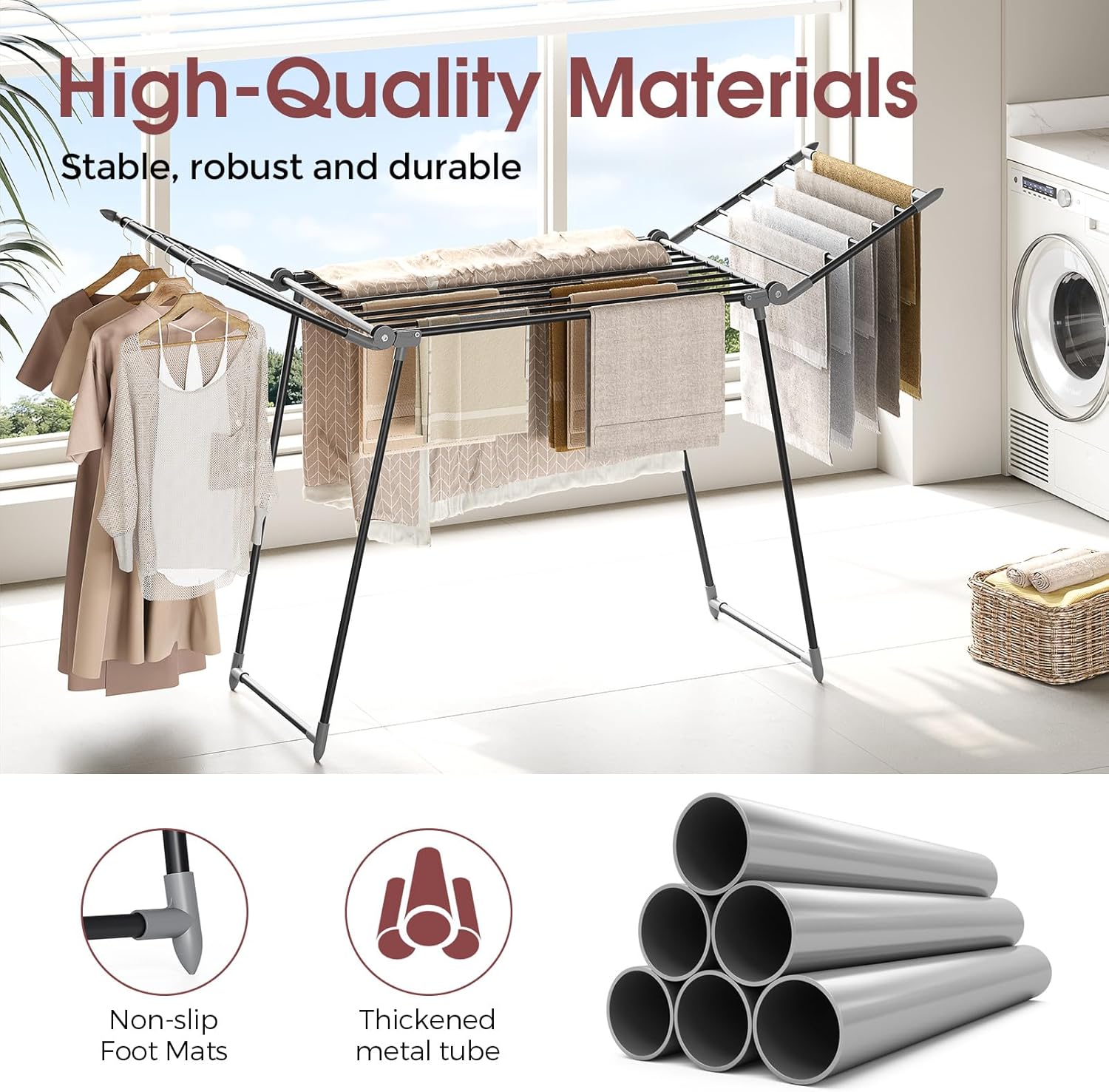 • Premium Built - The foldable dryer rack is made of heavy duty metal and hard plastic to ensure the stability and durability of the drying rack. The coating layer gives the clothes drying rack a rust-free and elegant looks for indoor and outdoor use