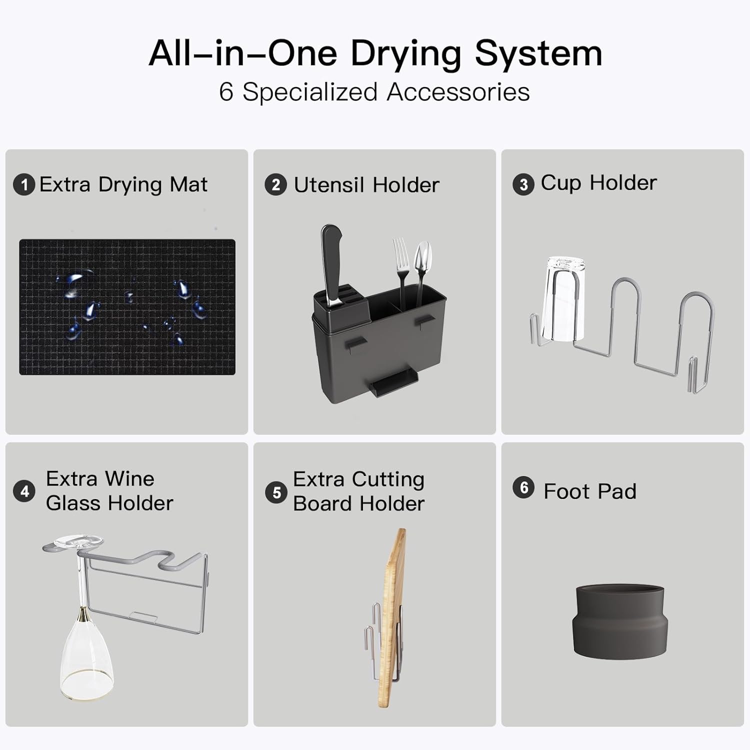 • 🛠️ All-in-One Drying System: 7 specialized accessories: drying mat, utensil holder, drainboard set, wine glass holder, cup holders, cutting board slot, non-slip feet cover. Stores all dish types vertically or horizontally. Maximizes small kitchens