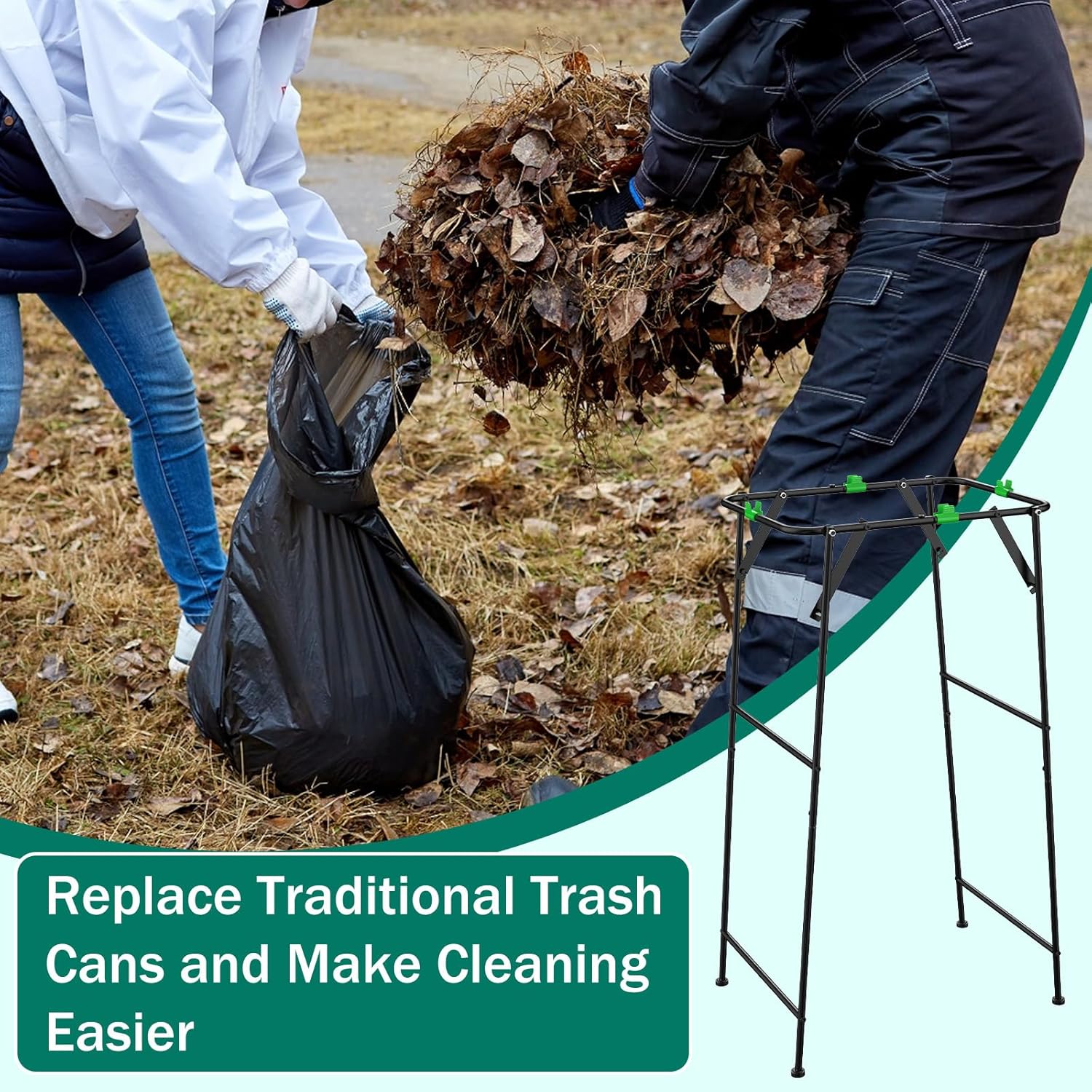 • Foldable Trash Bag Holder: Our trash bag holder is a foldable design that combines convenience and practicality. It easily collects leaves, yard waste and recyclables while keeping the trash bag open for easy disposal. The foldable design makes it easy for you to store and transport