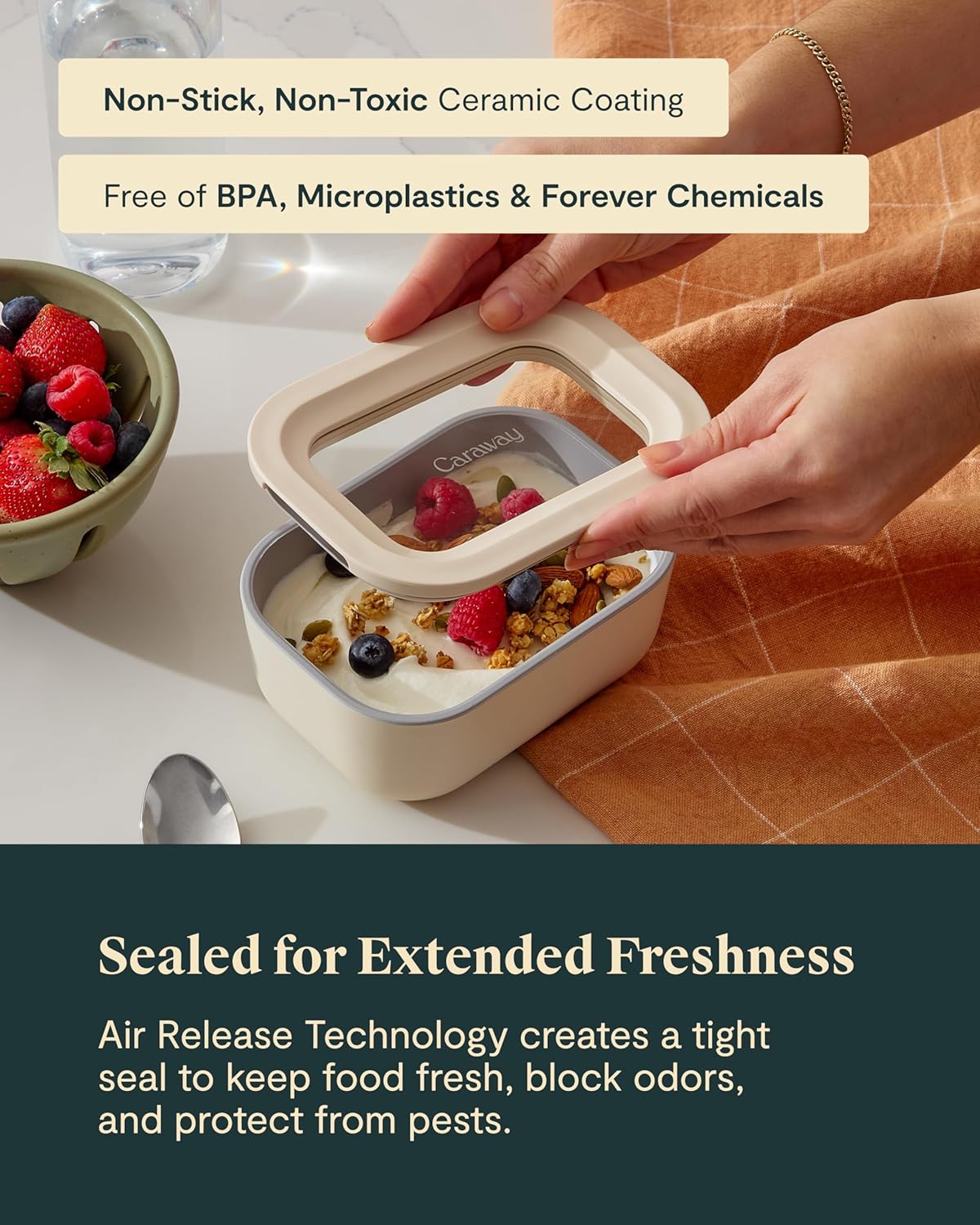 Caraway 2pc Glass Food Storage Set - 2.6 Cup Food Containers (2) - Non-Toxic Ceramic-Coated Glass - Air Release Technology - Compact & Stackable Design - Perracotta