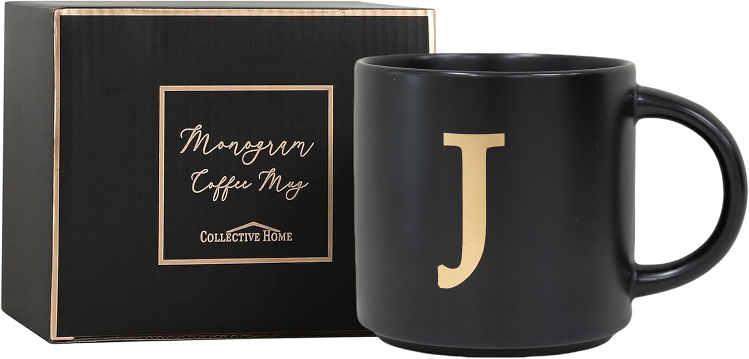 COLLECTIVE HOME - Monogram Ceramic Mugs, 15 oz Golden Initial Black Coffee Cups, Elegant Alphabet Tea Mugs, Elegant Personalized Mug with Gift Box, Unique Mug with Double Side Capital Lette (J)