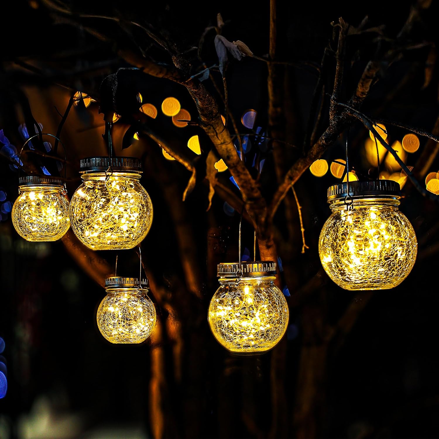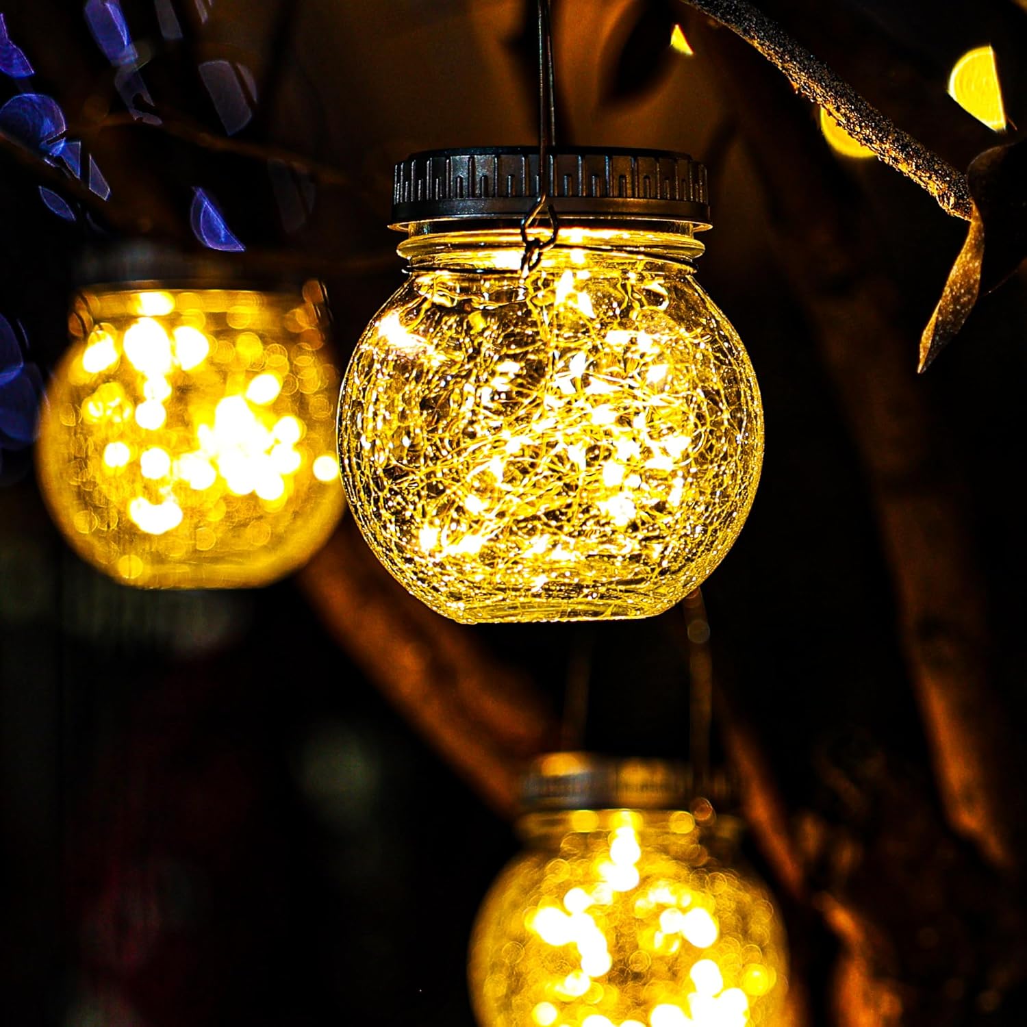 Cooo 2 Pack Crackle Glass Solar Lantern with 30 LED Firefly Lights– Waterproof Outdoor Hanging Lamp 215% Larger Solar Panel, Anti-Rust Lids Decorative Lighting for Garden Patio Table