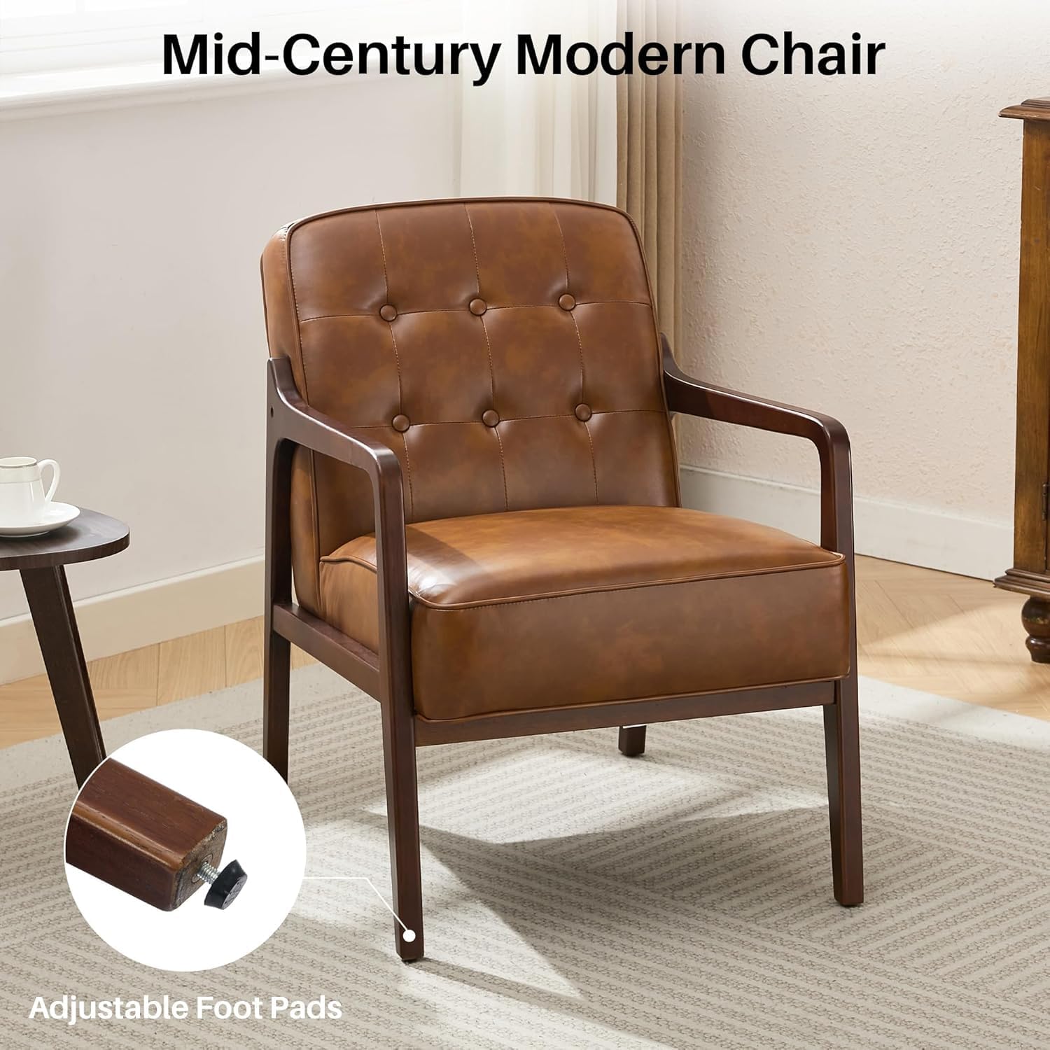 Faux Leather Accent Chair Set of 2, Mid Century Chair for Living Room, Upholstered Comfy Lounge Armchair with Solid Wood Frame, Modern Chair for Bedroom,105°Ergonomic Comfort, Brown