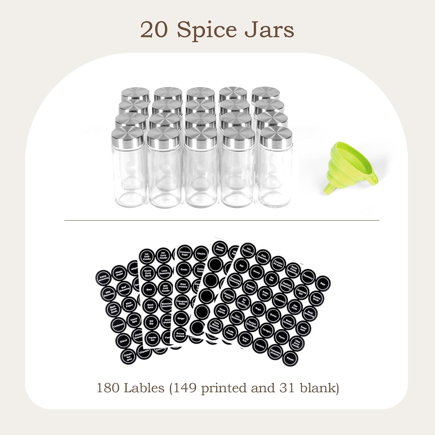 • 【All-Inclusive Set】Includes 20 airtight glass jars, funnel, 180 lables(149 printed and 31 blank), functional kitchen spice organizer.