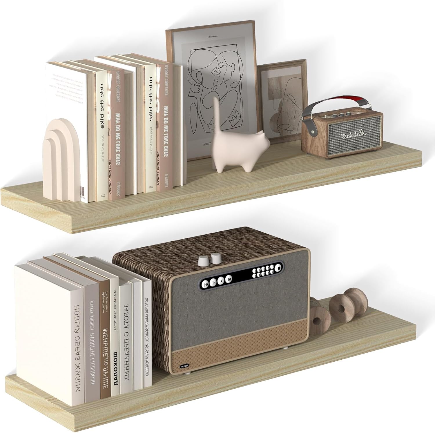 • 【Heavy-Duty Wall Mounted Wood Shelves】- Engineered from premium solid wood, these shelves wall mounted support up to 22lbs per shelf—ideal for heavy cookbooks, kitchenware, or electronics. Reinforced brackets prevent sagging, ensuring lasting durability for your storage needs.