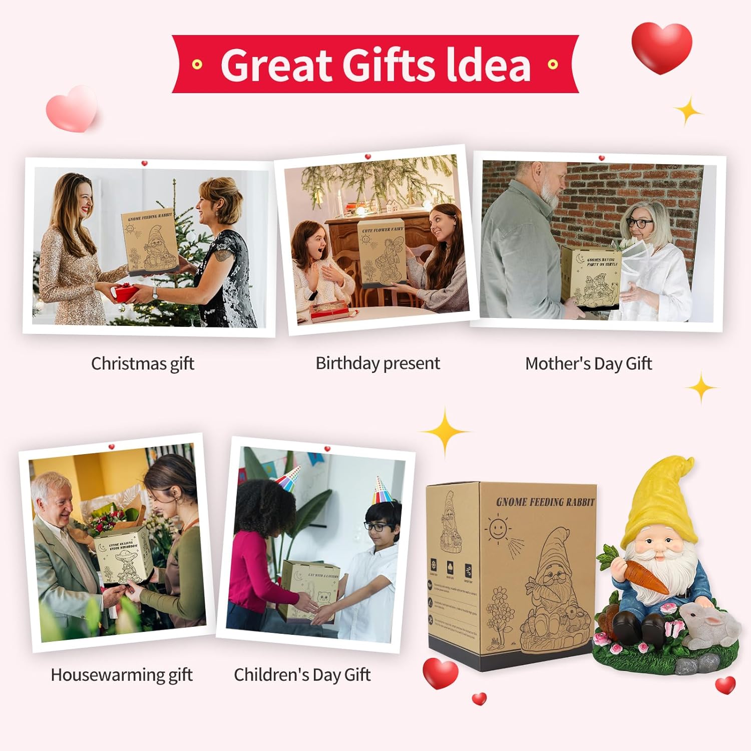 Solar Garden Outdoor Statues Gnome Feeding Rabbit with 6 LED Solar Figurine for Lawn,Patio,Balcony,Yard Decor Unique Housewarming Gift, for Grandfather, Father,Grandma
