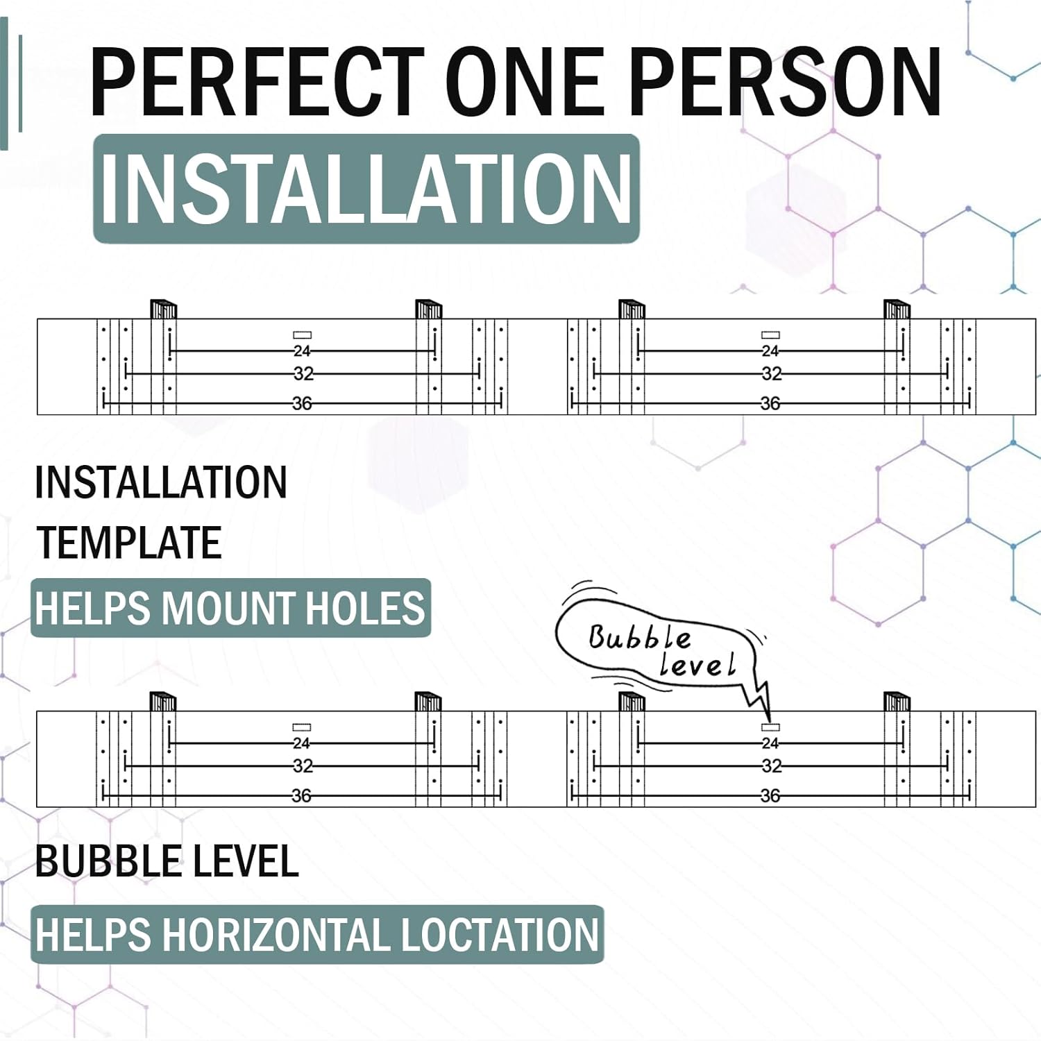 • 【Quick – Secure Setup】: Easy one-person installation with all hardware included: Installation Template helps mount holes; Bubble Level helps get perfect horizontal location.