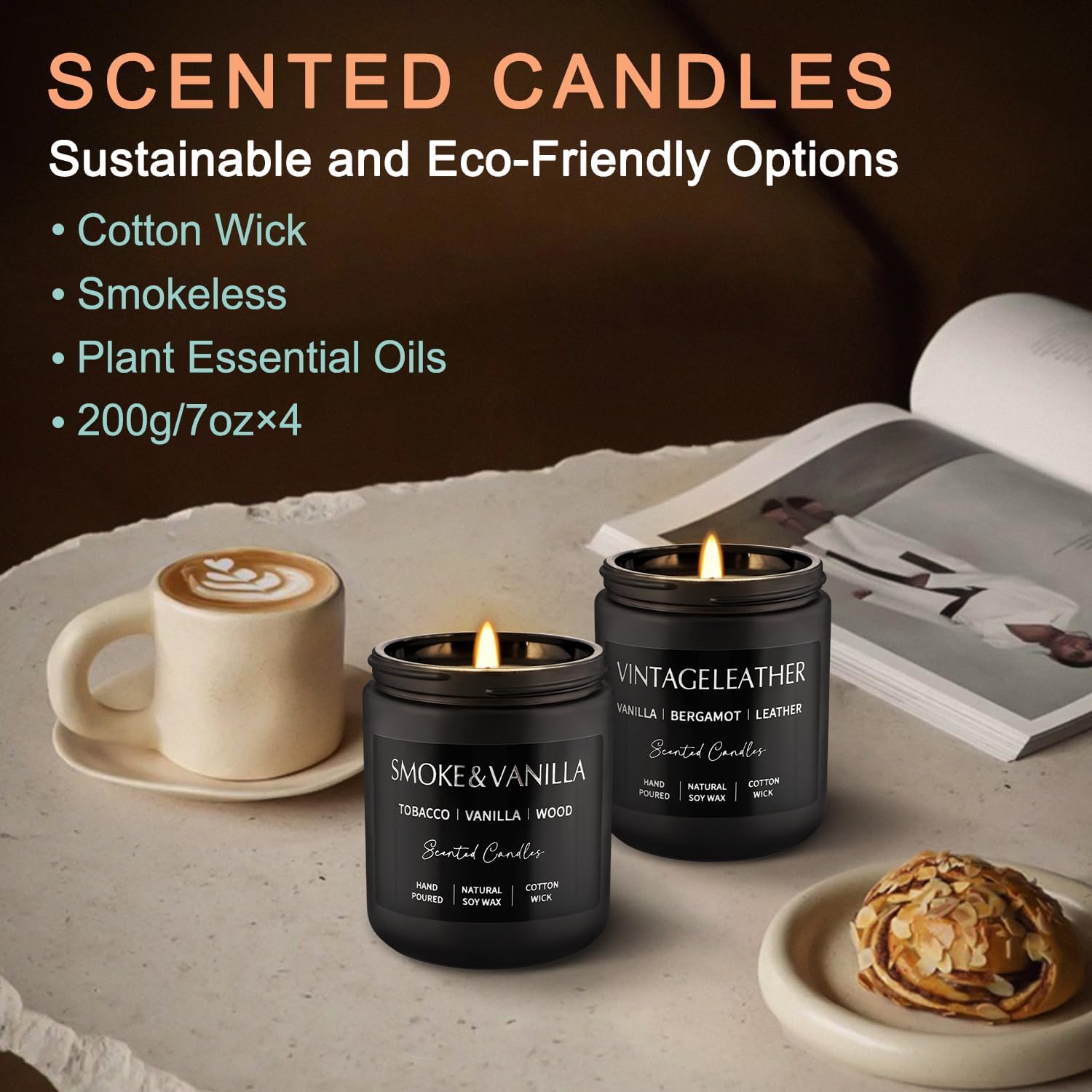 Scented Candles Gift Set - 4 Pack (7oz Each) Soy Wax Aromatherapy Candles with Essential Oils, Smokeless - Leather & Smoke, Vanilla Oakmoss, Lavender - Relaxing Fragrance for Home, Office, Yoga