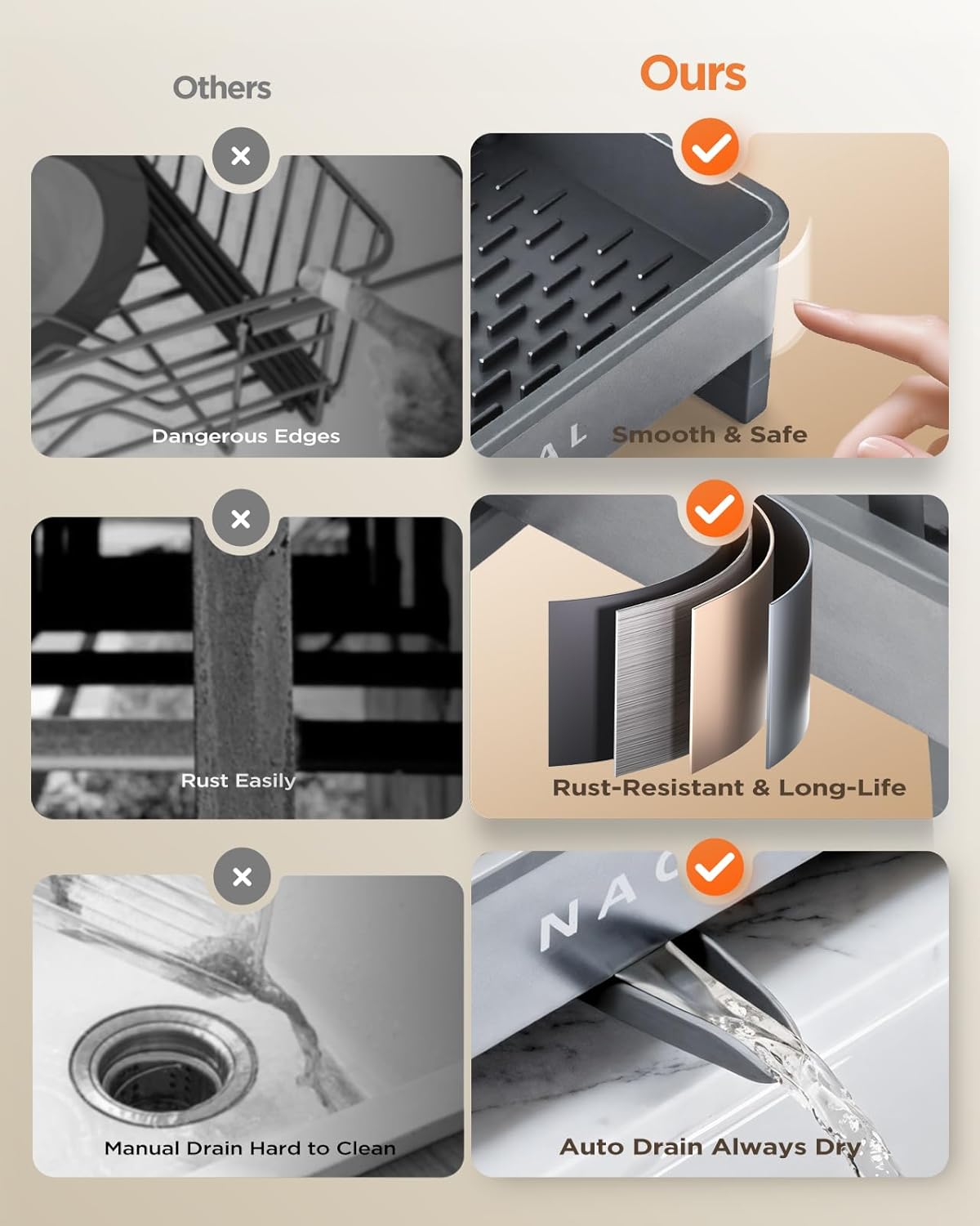 • Adjustable Height, Perfect Fit: Nacial sink sponge holder features a detachable base with customizable height, adapting to any sink. Unlike conventional sponge holders posing cut risks, Nacial enforces precision-rounded guards that eliminate injuries.Critically, while other organizers trap moisture leading to rust, Nacial 304 stainless steel & auto-drain desgin ensures lasting dryness through rapid drainage. Get your Nacial, Your indispensable kitchen essential