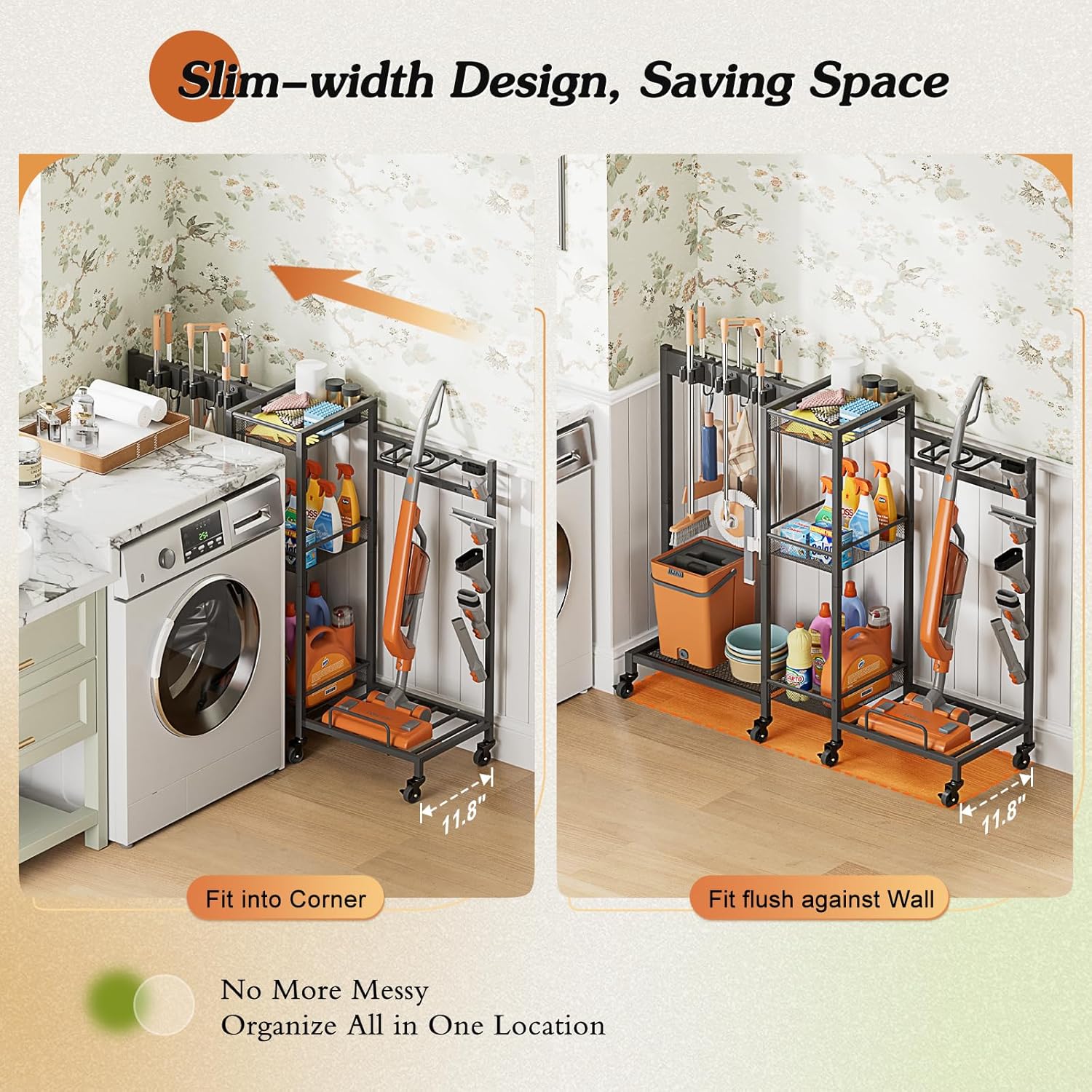 • 【Heavy-duty Broom Caddy with Wheels】Crafted with heavy-duty, thickened steel, the utility cart on wheels is built to last. The reinforced frame offers excellent load-bearing capacity and long-term stability—no wobbling, bending, or rusting. A reliable solution for daily use, even with heavy cleaning gear.