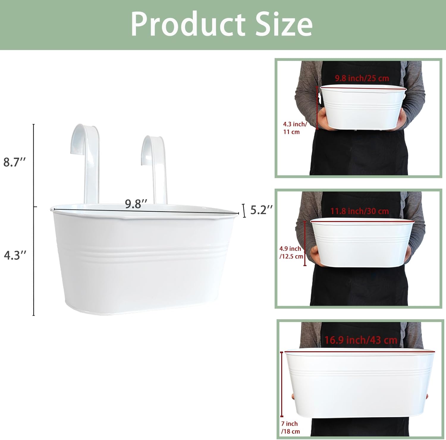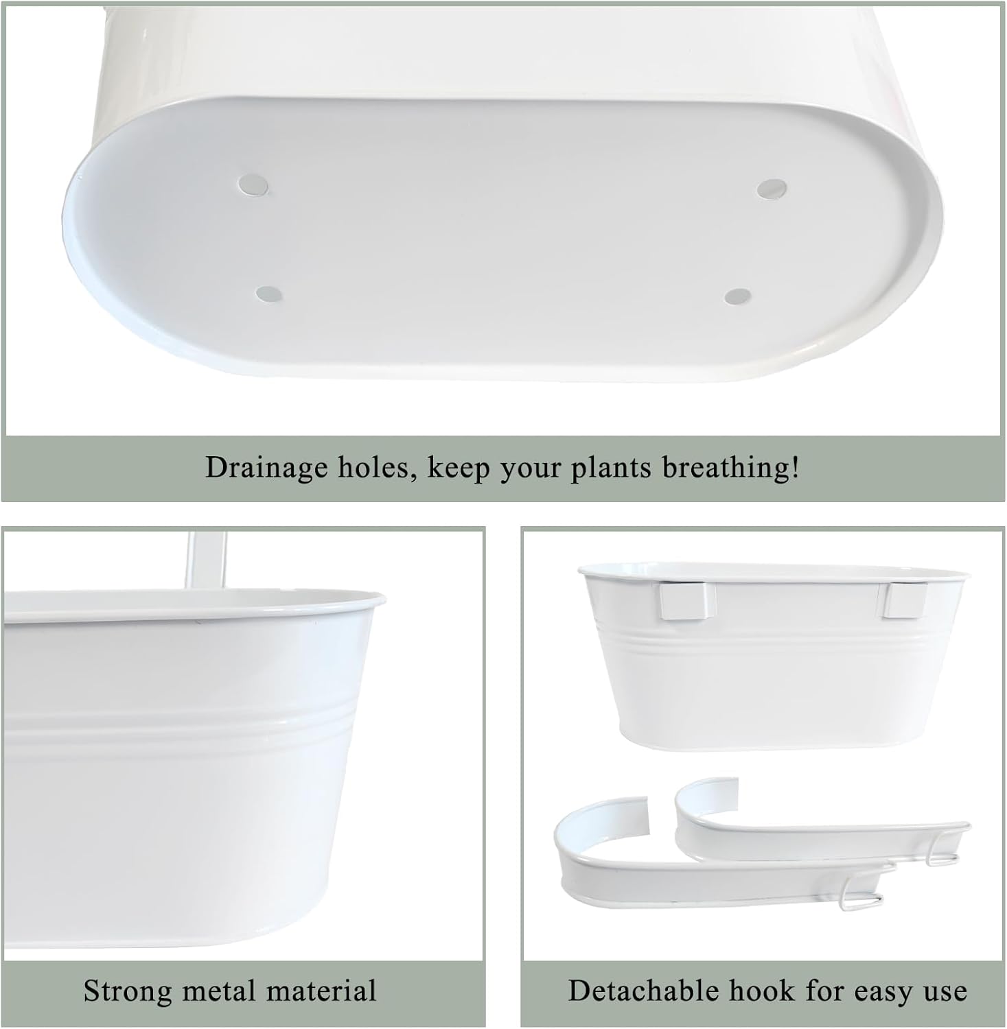 • Detachable Hook & Drainage Hole: The removable hook makes it easy to hang on deck railings, fences, or windows. The drainage hole prevents overwatering, keeping plants healthy. Great for patio planters, herb gardens, or succulents—indoors or outdoors