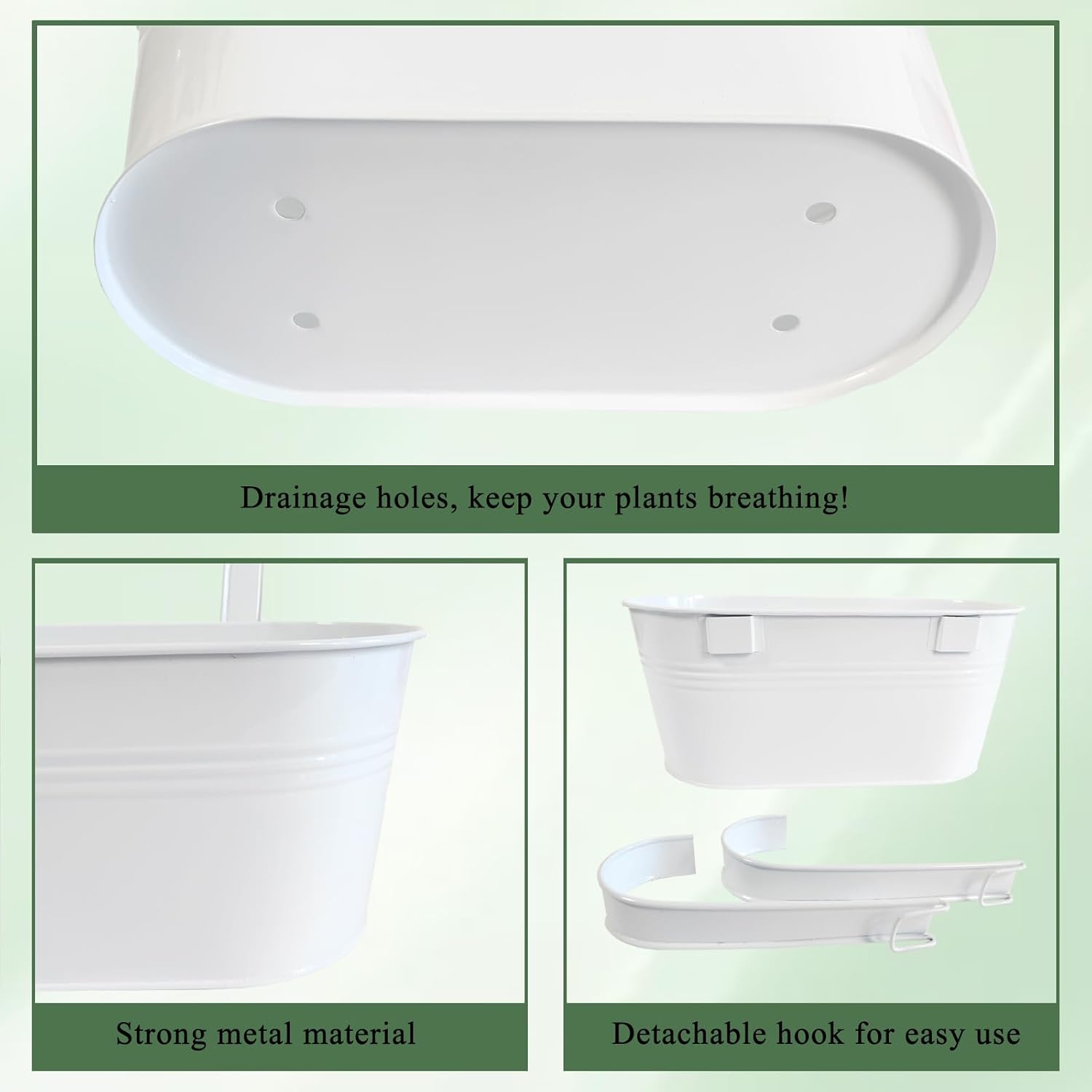 • Detachable Hook & Drainage Hole: The removable hook makes it easy to hang on deck railings, fences, or windows. The drainage hole prevents overwatering, keeping plants healthy. Great for patio planters, herb gardens, or succulents—indoors or outdoors