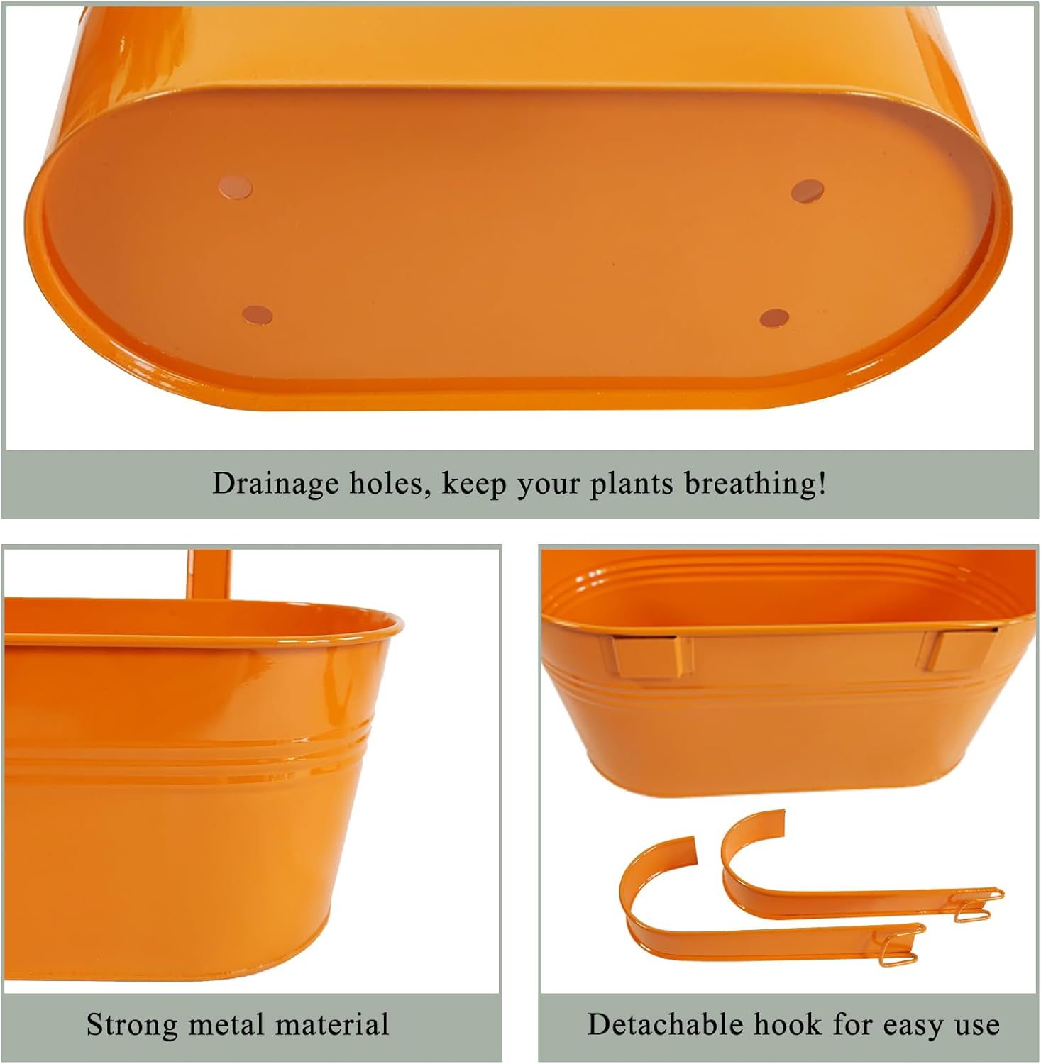 • Detachable Hook & Drainage Hole: The removable hook makes it easy to hang on deck railings, fences, or windows. The drainage hole prevents overwatering, keeping plants healthy. Great for patio planters, herb gardens, or succulents—indoors or outdoors