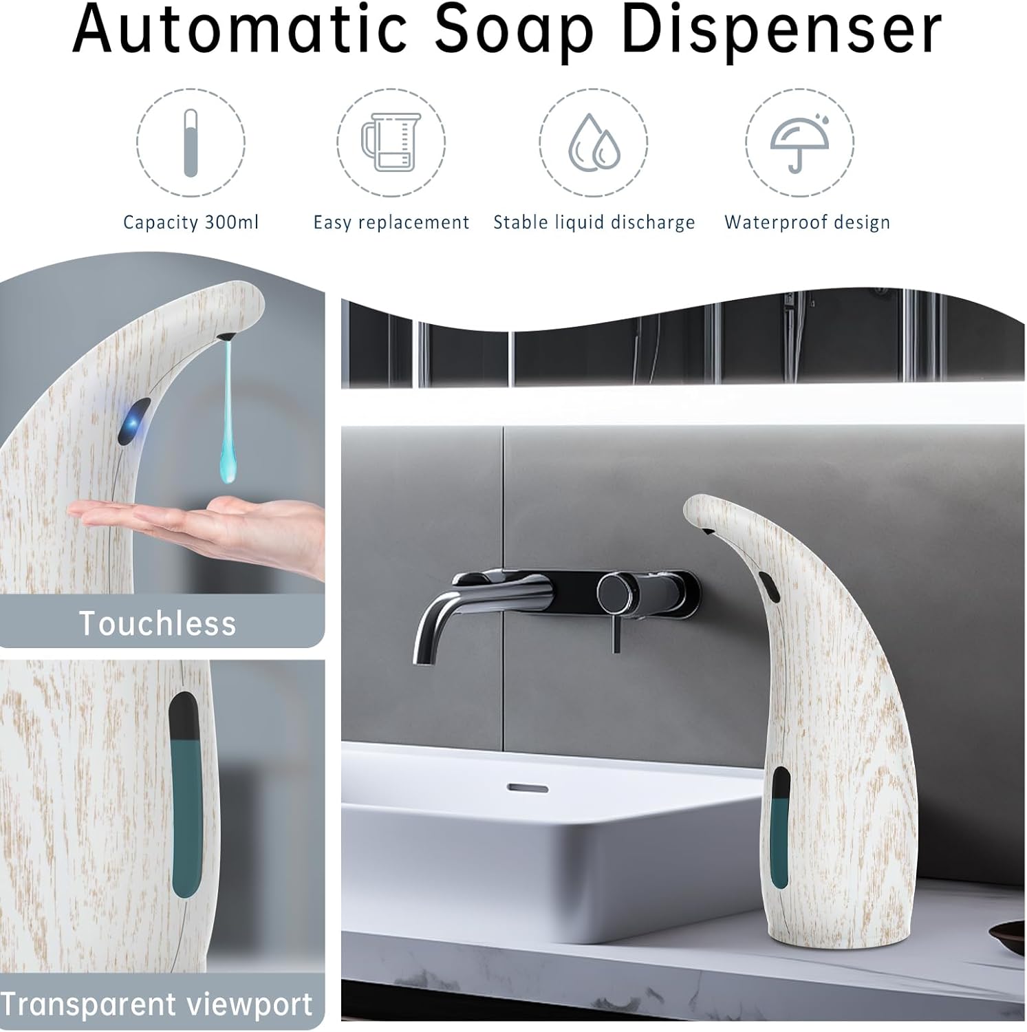 • 【Elegant Woodgrain Design】This plastic soap dispenser features a premium woodgrain finish that adds natural warmth to any space. The auto hand soap dispenser blends beautifully with farmhouse, modern or traditional decors while being easy to clean and maintain. Its scratch-resistant surface stays looking new even with daily use.