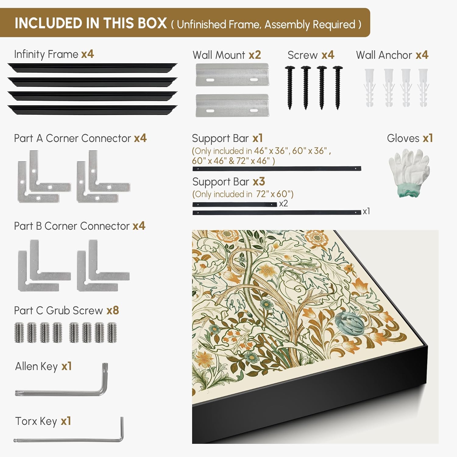 • Assembly Required: The artwork comes with the frame components unassembled. Don’t worry — setup is straightforward and tool-friendly. For best results and accurate alignment, we recommend two people to ensure a smooth assembly and a stable, secure wall mount.