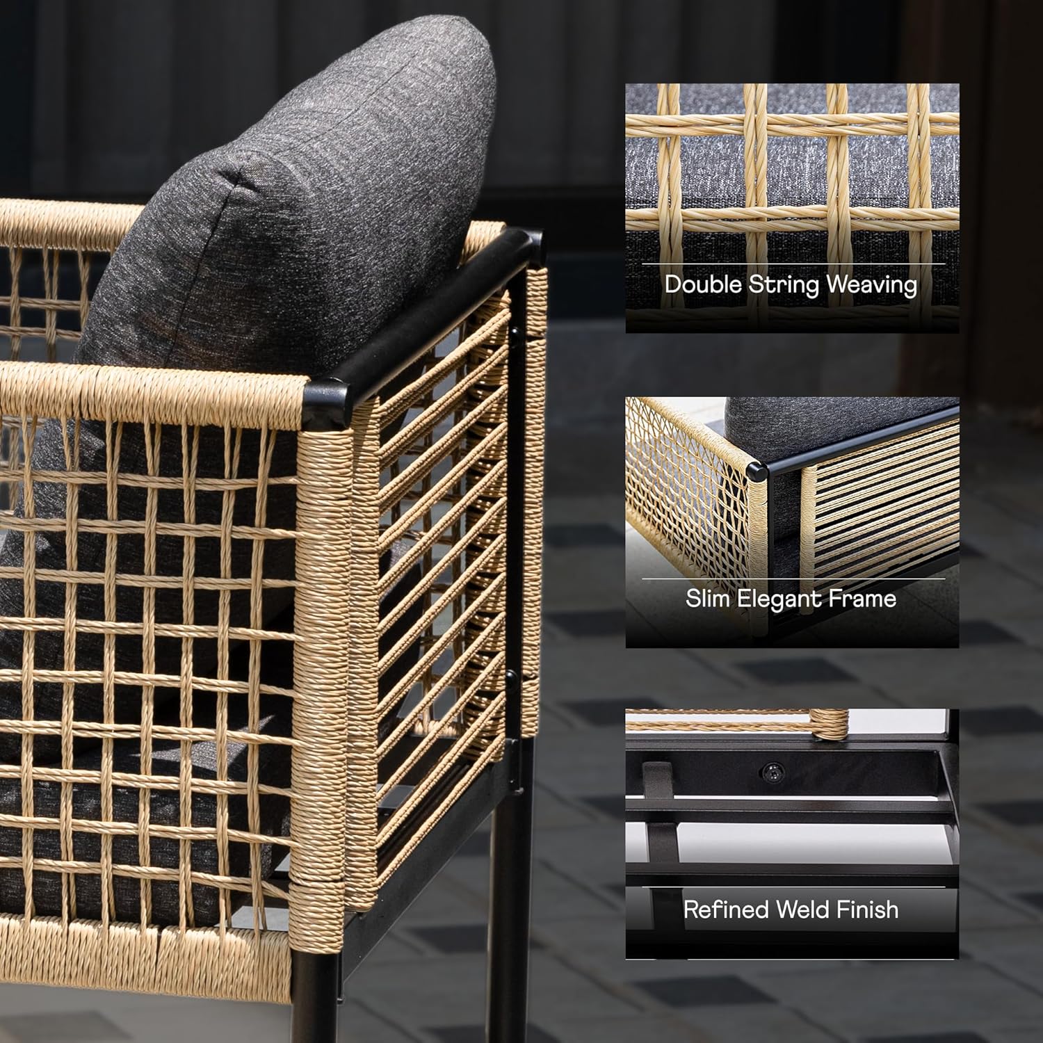 • WEATHER-RESISTANT ROPE WEAVE DESIGN: Featuring handwoven rope detailing on the armrests; these chairs give a stylish touch while offering durability; the weather-resistant rope is UV-tested to prevent fading and wear from sun exposure and rain