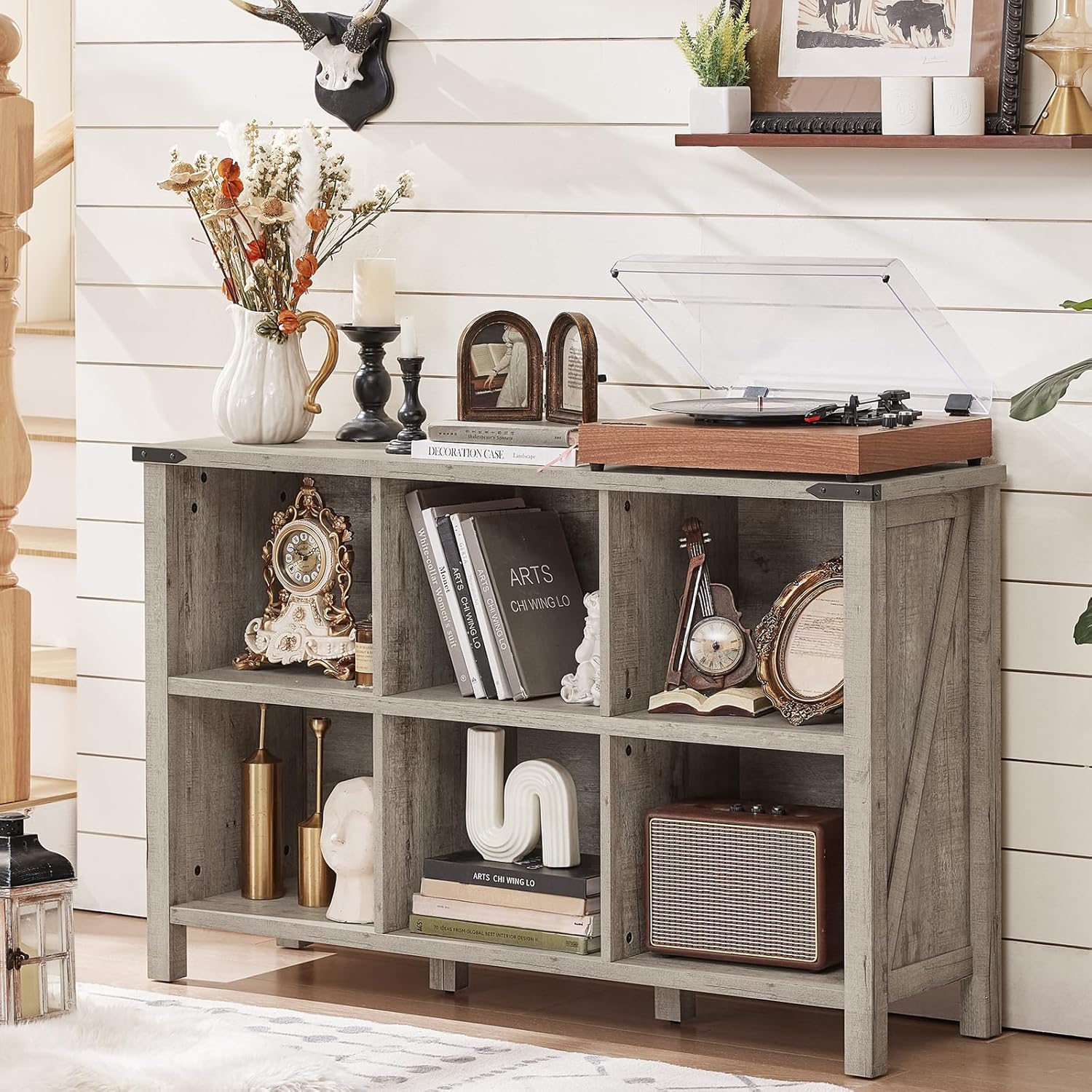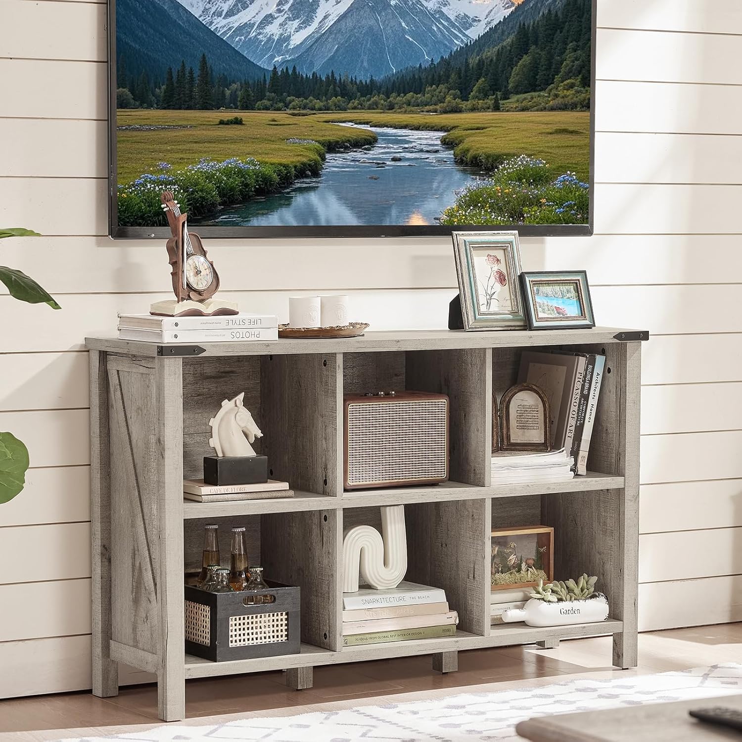 Farmhouse 6 Cube Bookshelf, Rustic Grey Oak Wooden Storage Organizer Book Shelf, 47 Inch Cubby Hallway Bookcase, Kids Toy Storage Cabinet, Modern Open Book Case for Living Room, Hallway