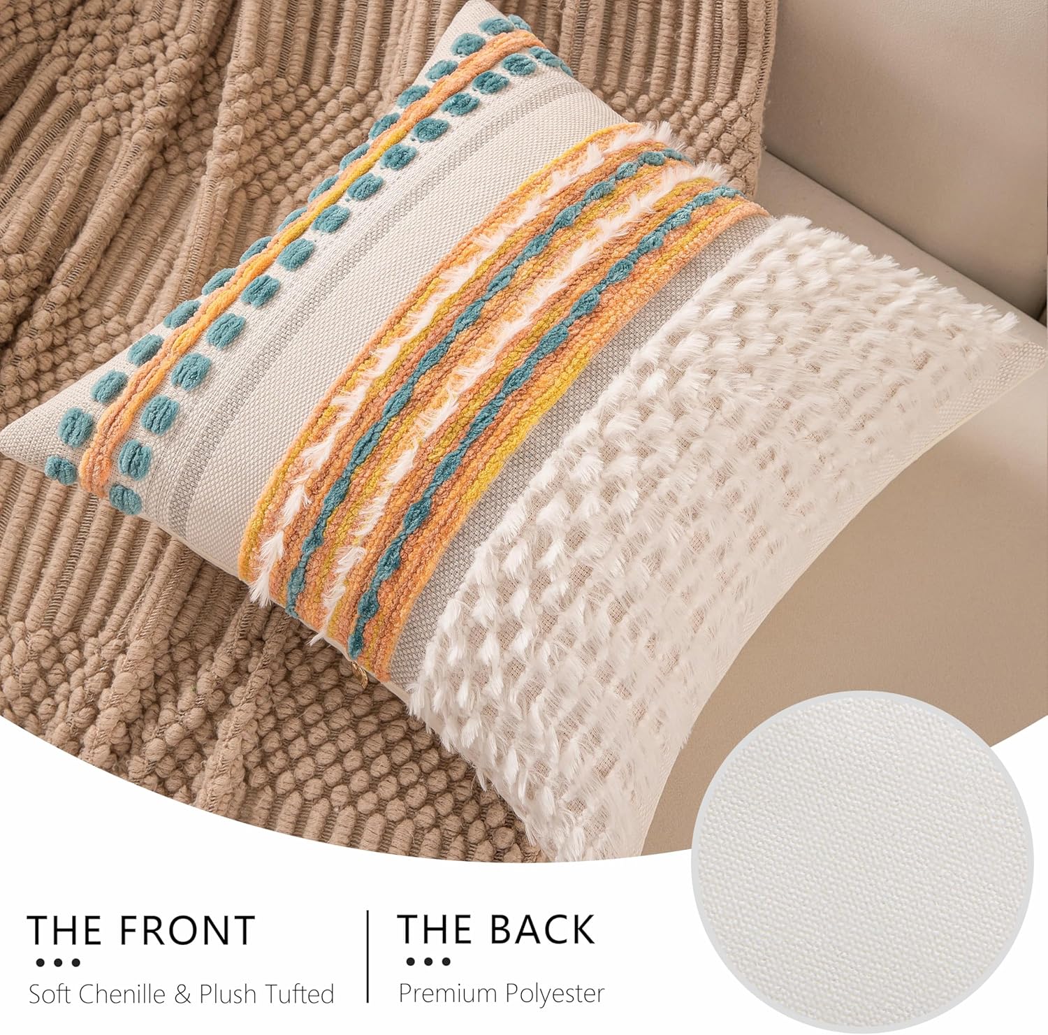 Boho Chenille Tufted Couch Throw Pillow Covers 18x18 Inch Set of 2 Farmhouse Striped Decorative Pillow Covers Accent Neutral Pillowcase Yellow Teal Cushion Cover for Living Room Sofa Bed