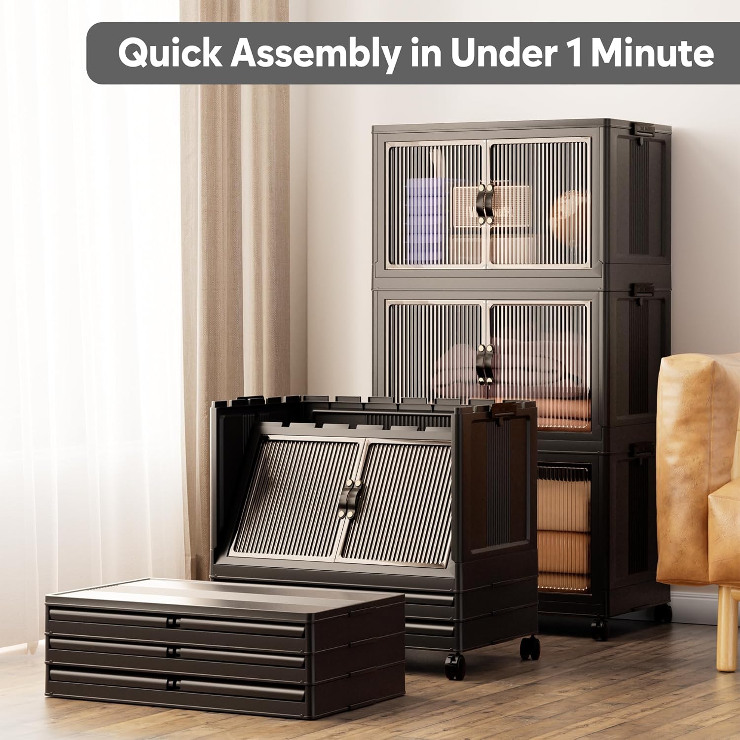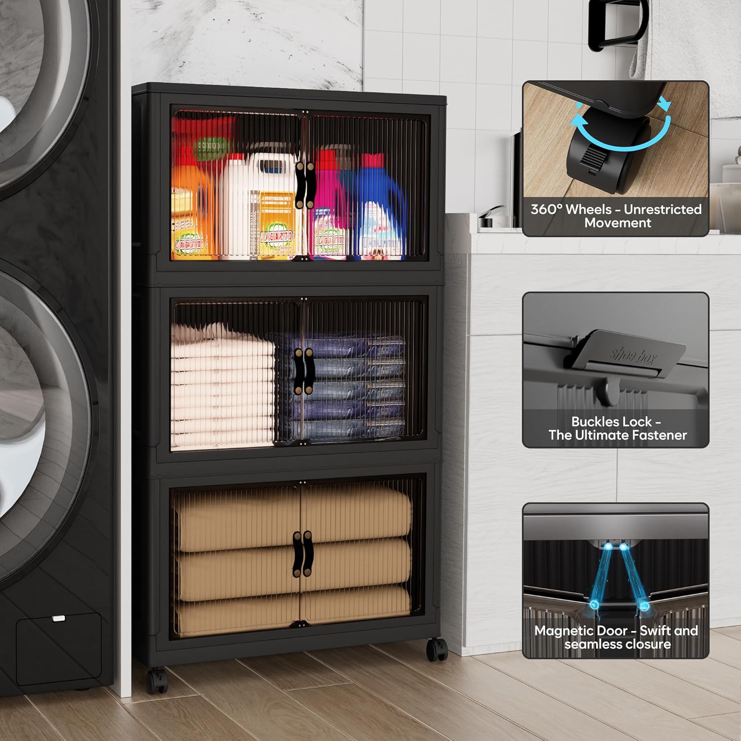 • 【Magnetic Doors & Rotating Wheels】The bins offer two opening options: front or top. The magnetic closure allows easy access. The 4 rotating 360-degree wheels make them easy to move, ideal for use in storage and organization in any room like your closet or bathroom.