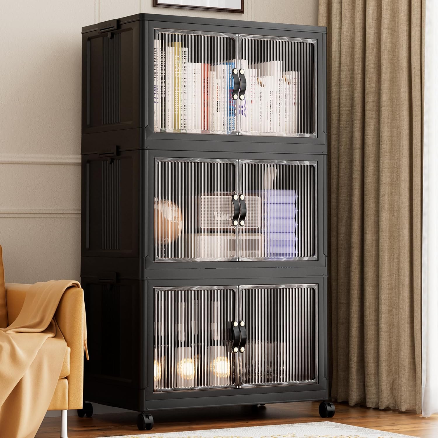Jalove 50QT Plastic Storage Bins with lids, Stackable Collapsible Storage Containers with Wheels, Closet Organizer and Storage Drawers, Clothes Storage Cabinet for Home Office Garage, 3 Pack Black
